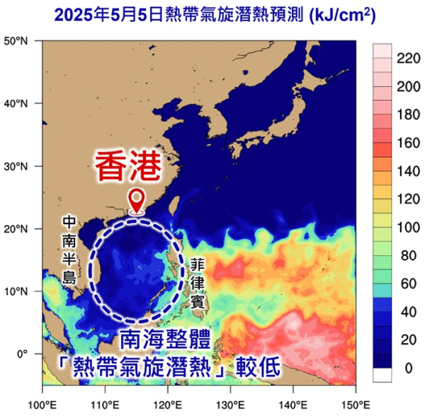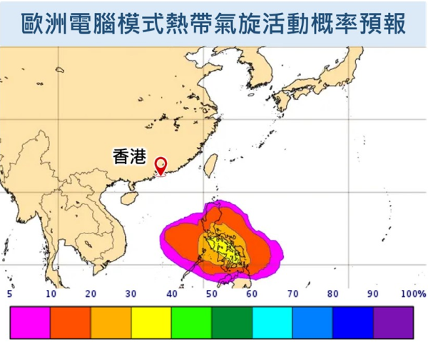 與此同時,遠在千里之外菲律賓以東的西北太平洋亦有對流雲團開始「蠢蠢欲動」,一個低壓區可能在周末期間開始為菲律賓一帶帶來不穩定天氣。不過,根據歐洲電腦模式最新的熱帶氣旋活動概率預報,該低壓區發展成熱帶風暴的機會低於一半。同時南海的熱帶氣旋潛熱較低,天文台表示,按現時評估,即使該低壓系統發展成熱帶氣旋,其顯著增強的機會不大。