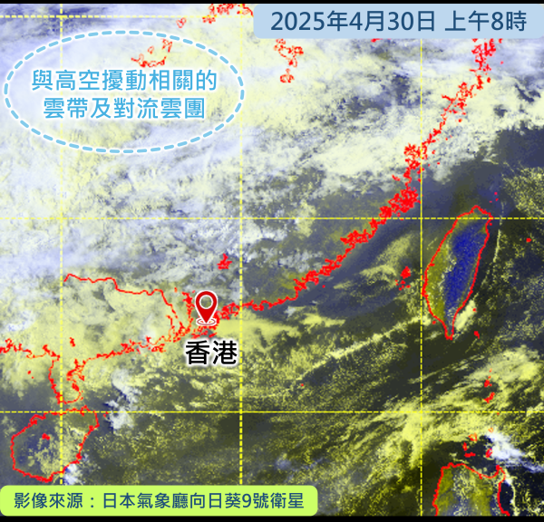 天文台今日(30日)發表「天氣隨筆」,「劇透」五一至佛誕長周末天氣。天文台指,受高空擾動影響,本港明日(5月1日,勞動節)會有幾陣驟雨,早上短暫時間有陽光,下午局部地區可能有雷暴。隨着高空擾動遠離,星期五至星期日(5月2日至4日)本港風勢微弱,日間炎熱,但局部地區有驟雨。另外,預料一道低壓槽會在星期一(5月5日,佛誕)至星期二(5月6日)影響廣東沿岸,該區天氣漸轉不穩定。