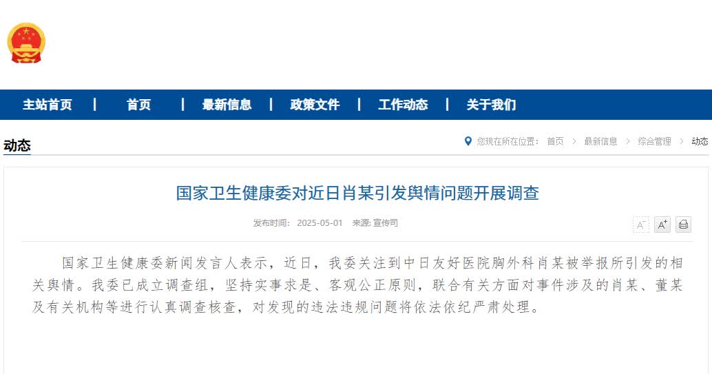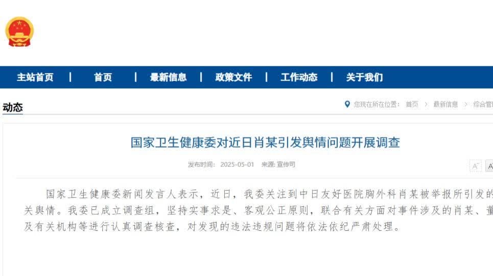 (大公文匯網記者 劉凝哲 北京報道)5月1日早上八時許,國家衞生健康委發布消息稱,近日,關注到中日友好醫院胸外科肖某被舉報所引發的相關輿情。目前,國家衞健委已成立調查組,堅持實事求是、客觀公正原則,聯合有關方面對事件涉及的肖某、董某及有關機構等進行認真調查核查,對發現的違法違規問題將依法依紀嚴肅處理。