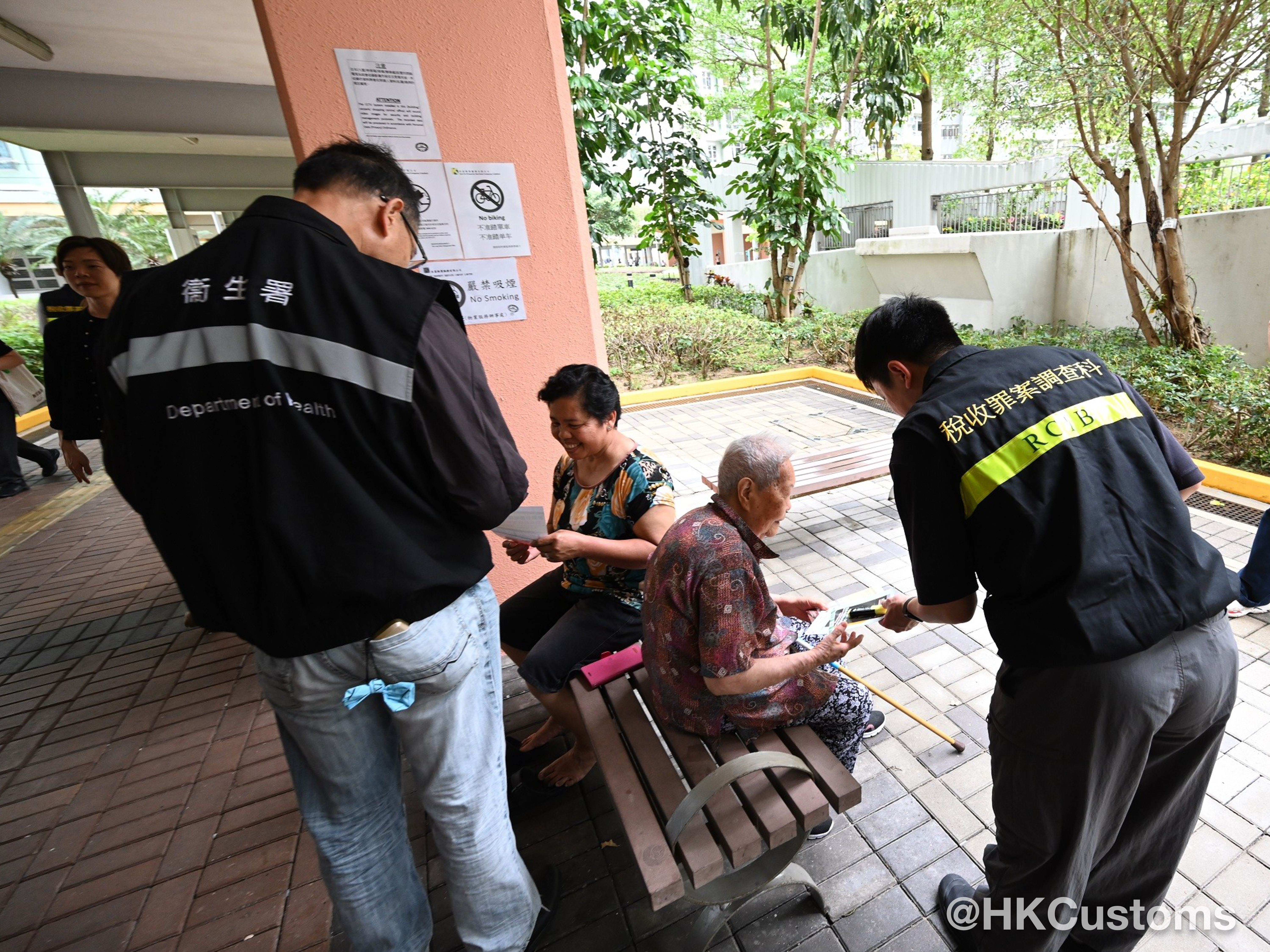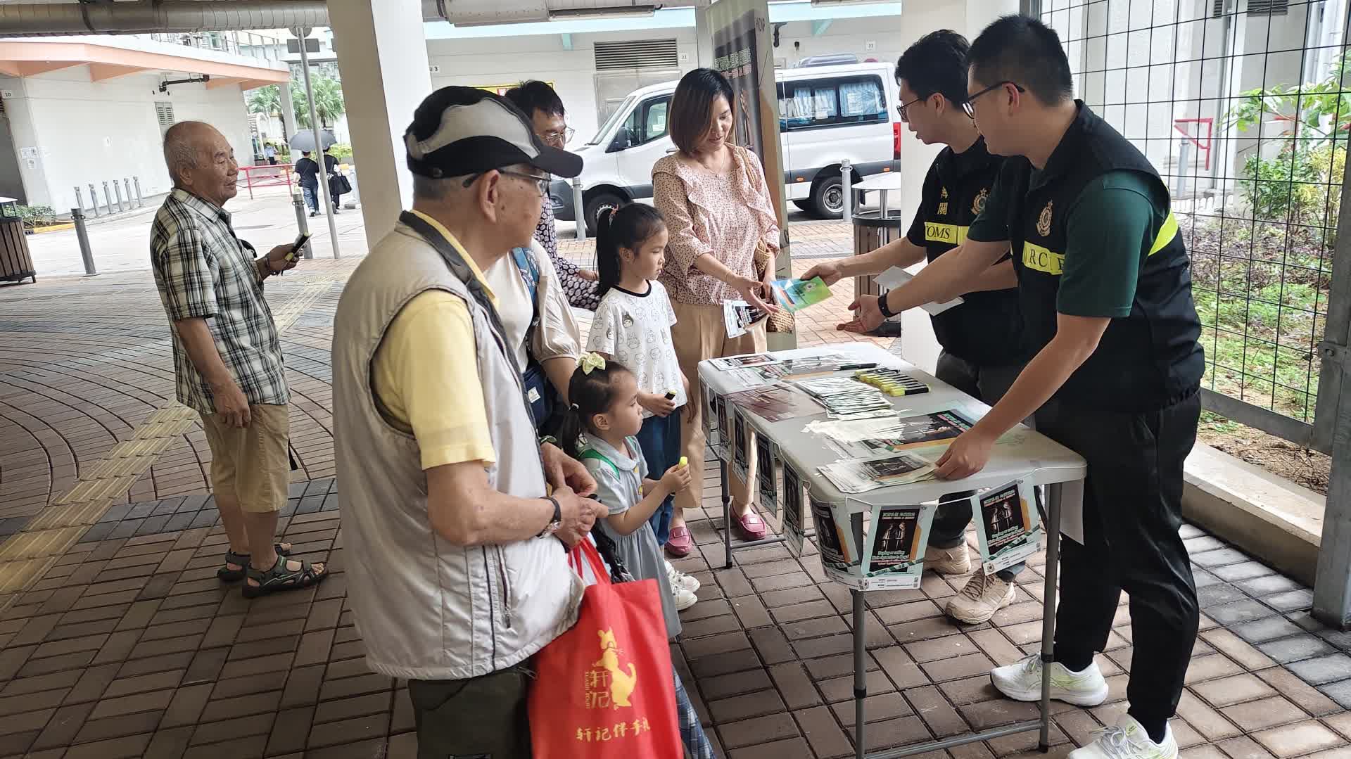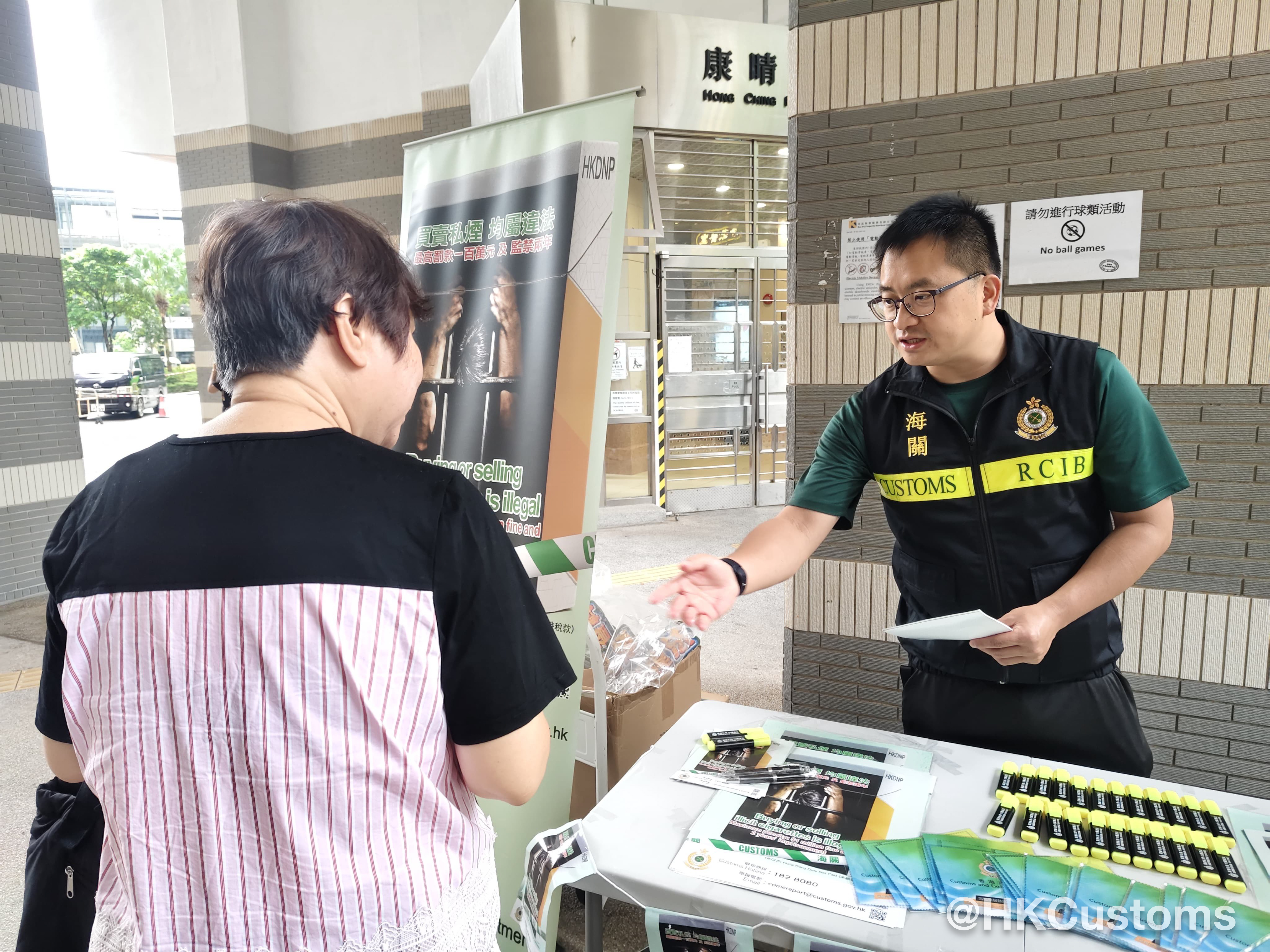 海關人員於屋邨範圍向居民派發反私煙宣傳單張和紀念品,以宣傳反私煙信息,並鼓勵他們向海關舉報懷疑買賣私煙活動。