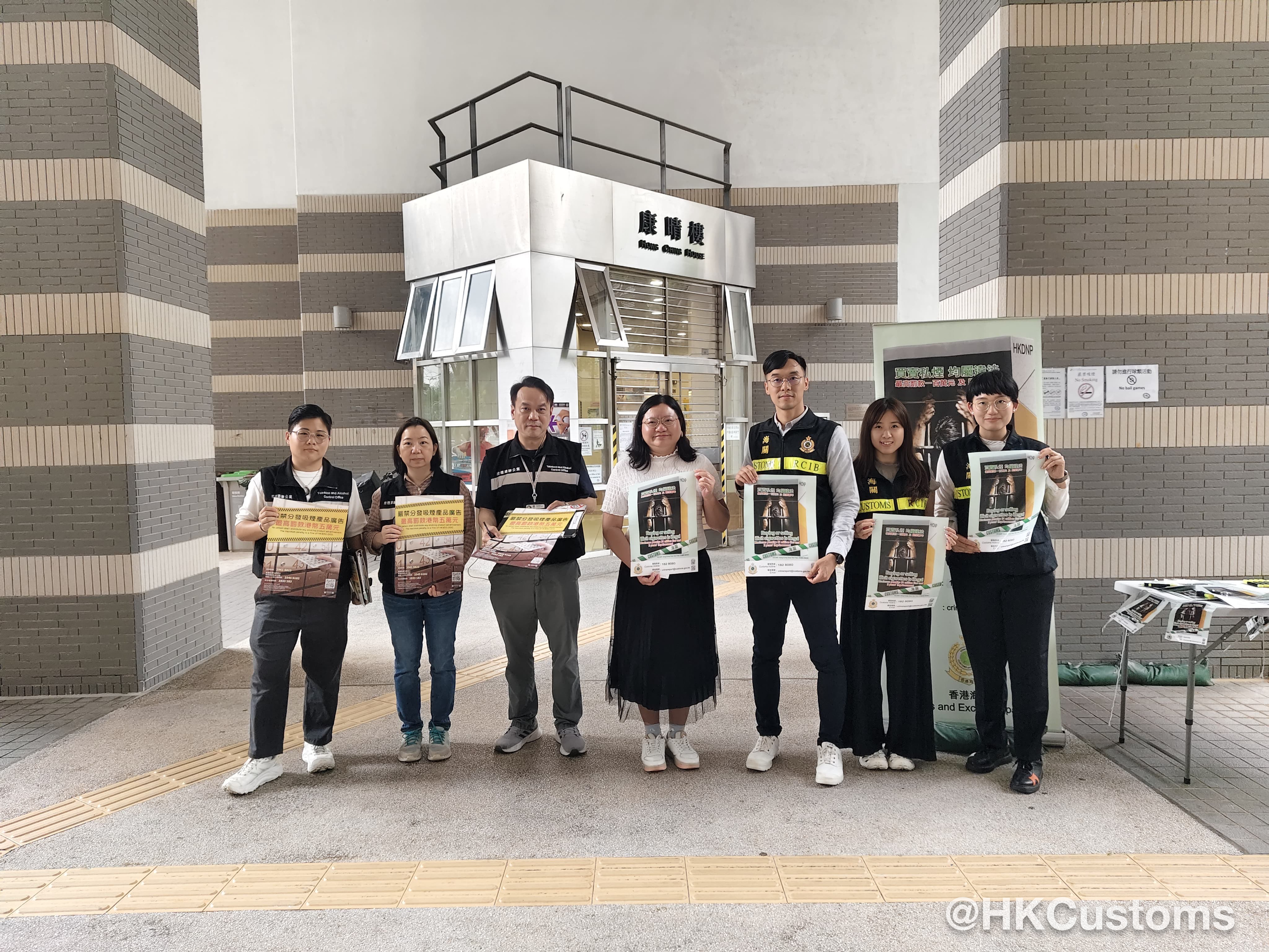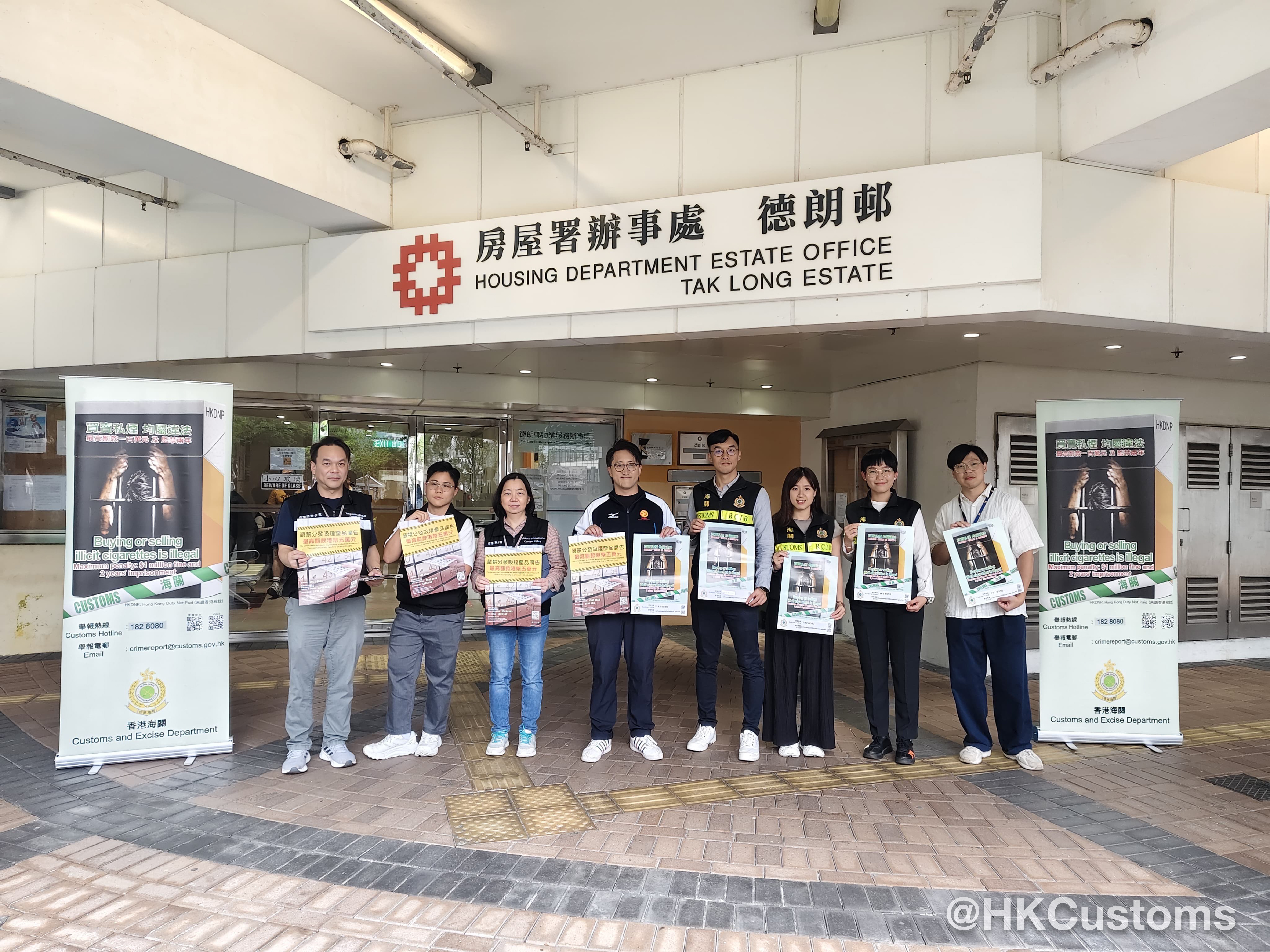 香港海關於四月二十五日與九龍城區區議員、衞生署控煙酒辦公室及房屋署在九龍城德朗邨及啟晴邨進行聯合反私煙宣傳活動。