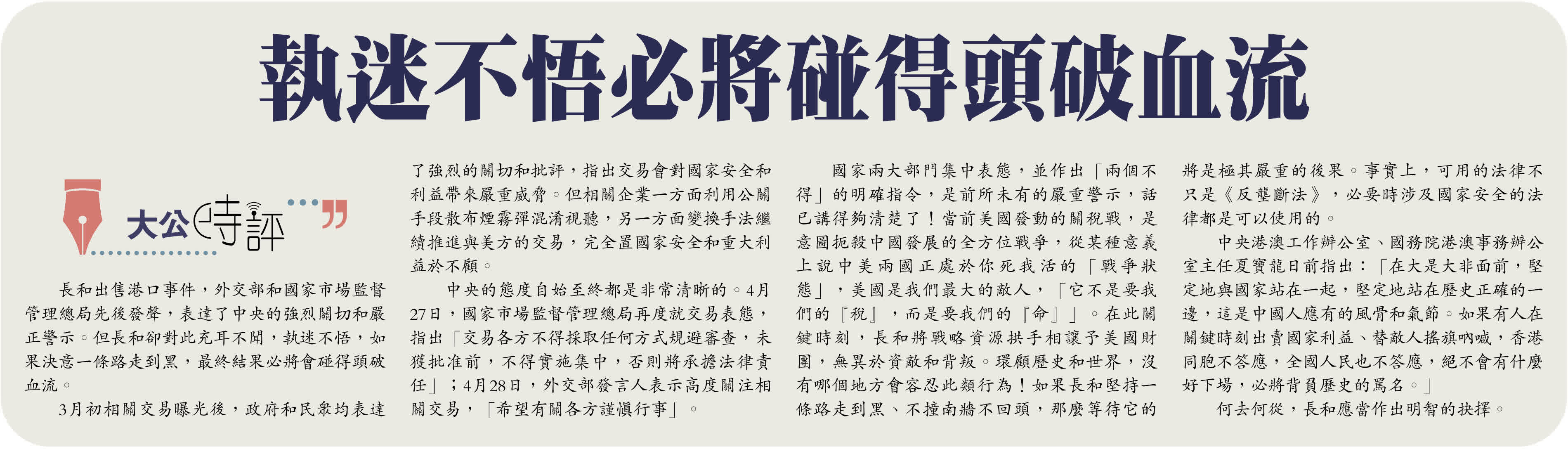 文章指出,長和「如果決意一條路走到黑,最終結果必將會碰得頭破血流。」「中央的態度自始至終都是非常清晰的……何去何從,長和應當作出明智的抉擇。」