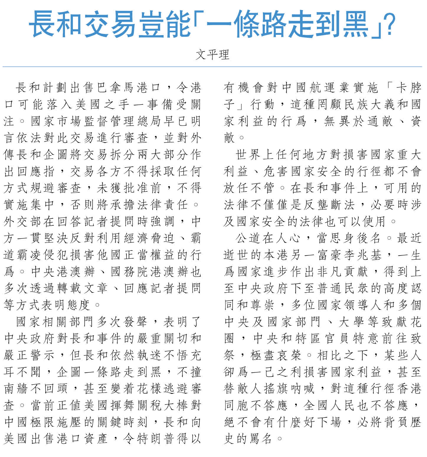 香港《文匯報》也刊發了署名文平理的評論文章,標題為《長和交易豈能「一條路走到黑」?》