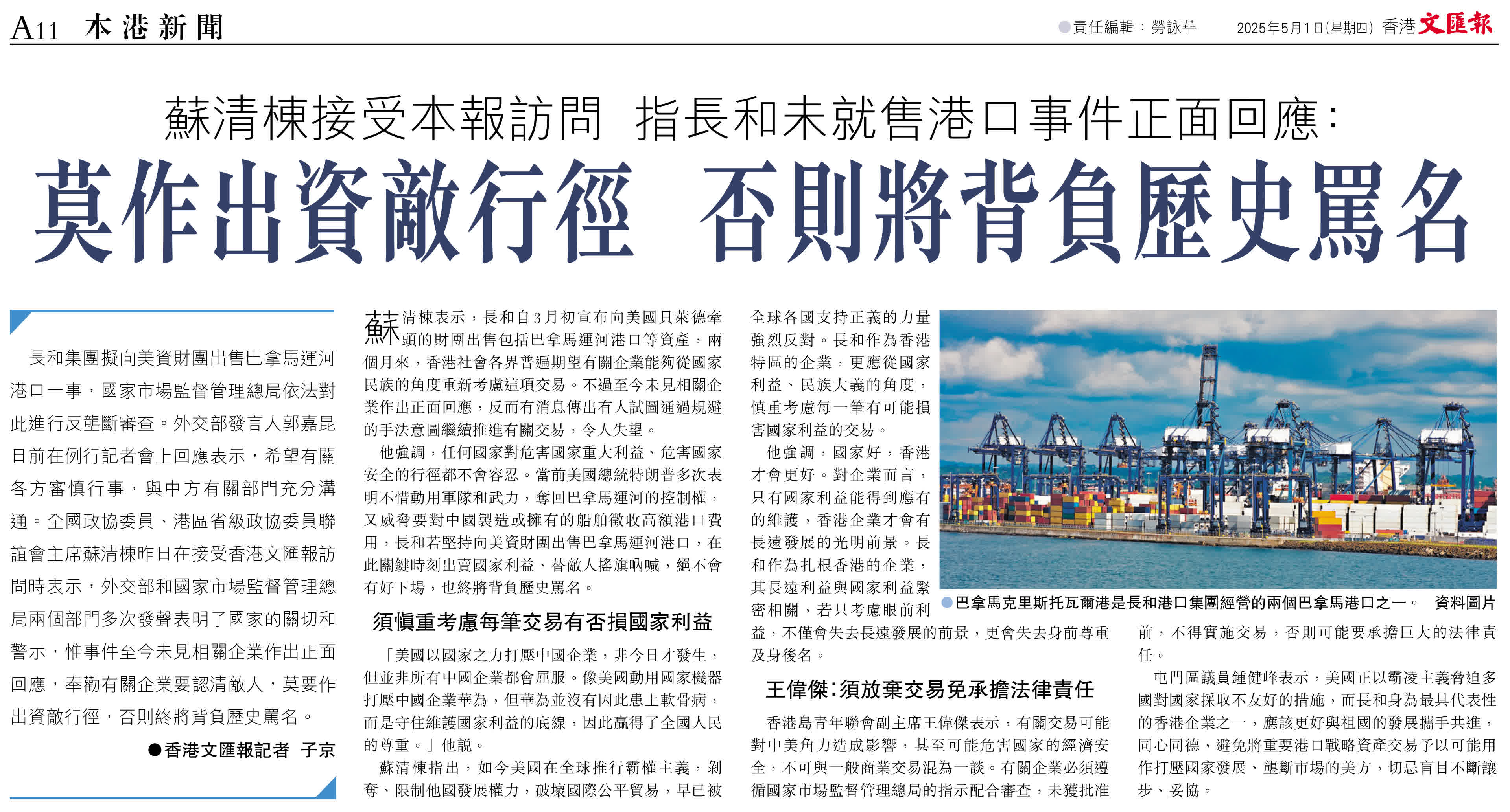 昨日,全國政協委員、港區省級政協委員聯誼會主席蘇清棟在接受《文匯報》訪問時表示,兩個月來,香港社會各界普遍期望有關企業能夠從國家民族的角度重新考慮這項交易。不過至今未見相關企業作出正面回應,反而有消息傳出有人試圖通過規避的手法意圖繼續推進有關交易,令人失望。