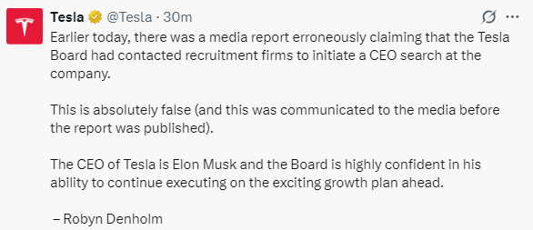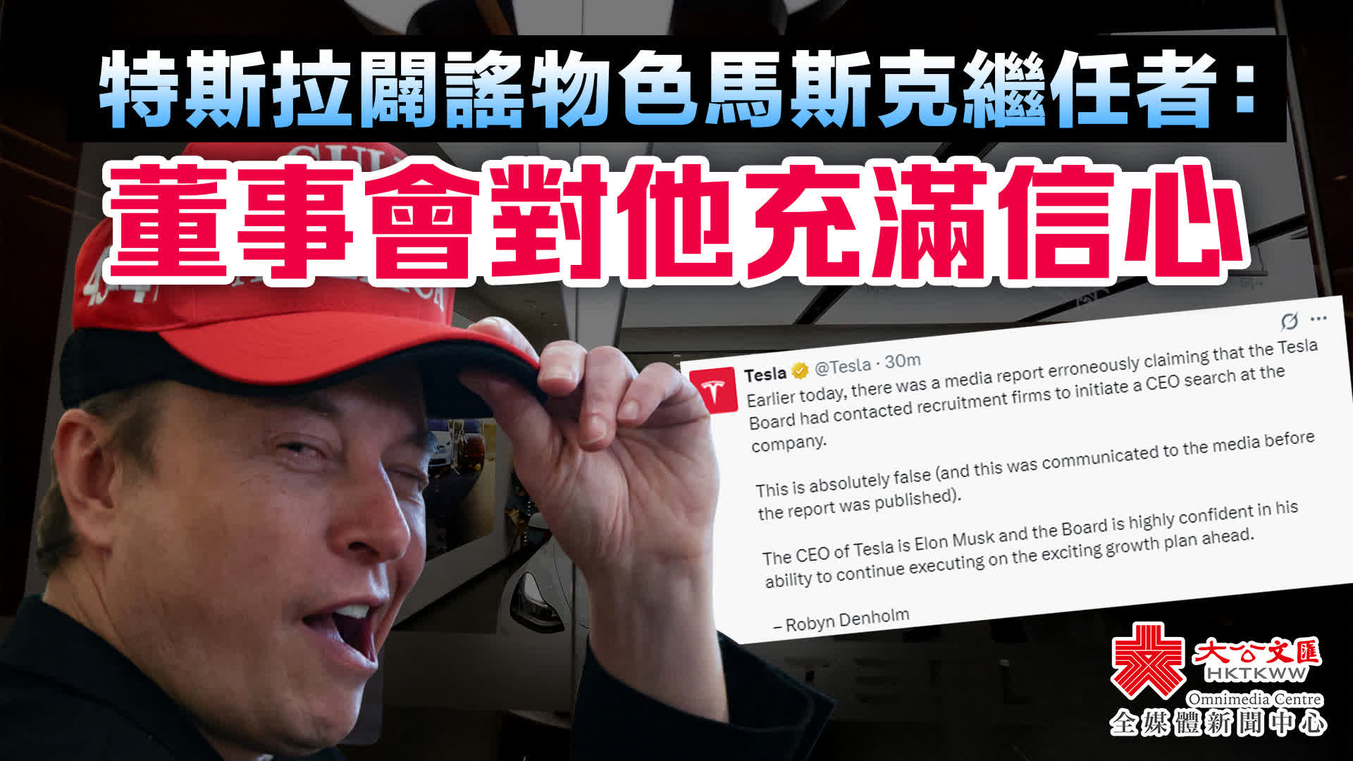 大公文匯全媒體報道,當地時間4月30日,美國汽車製造商特斯拉公司在社交媒體平台發文,對此前有關「公司考慮尋找馬斯克繼任者」的媒體報道進行了闢謠和說明。