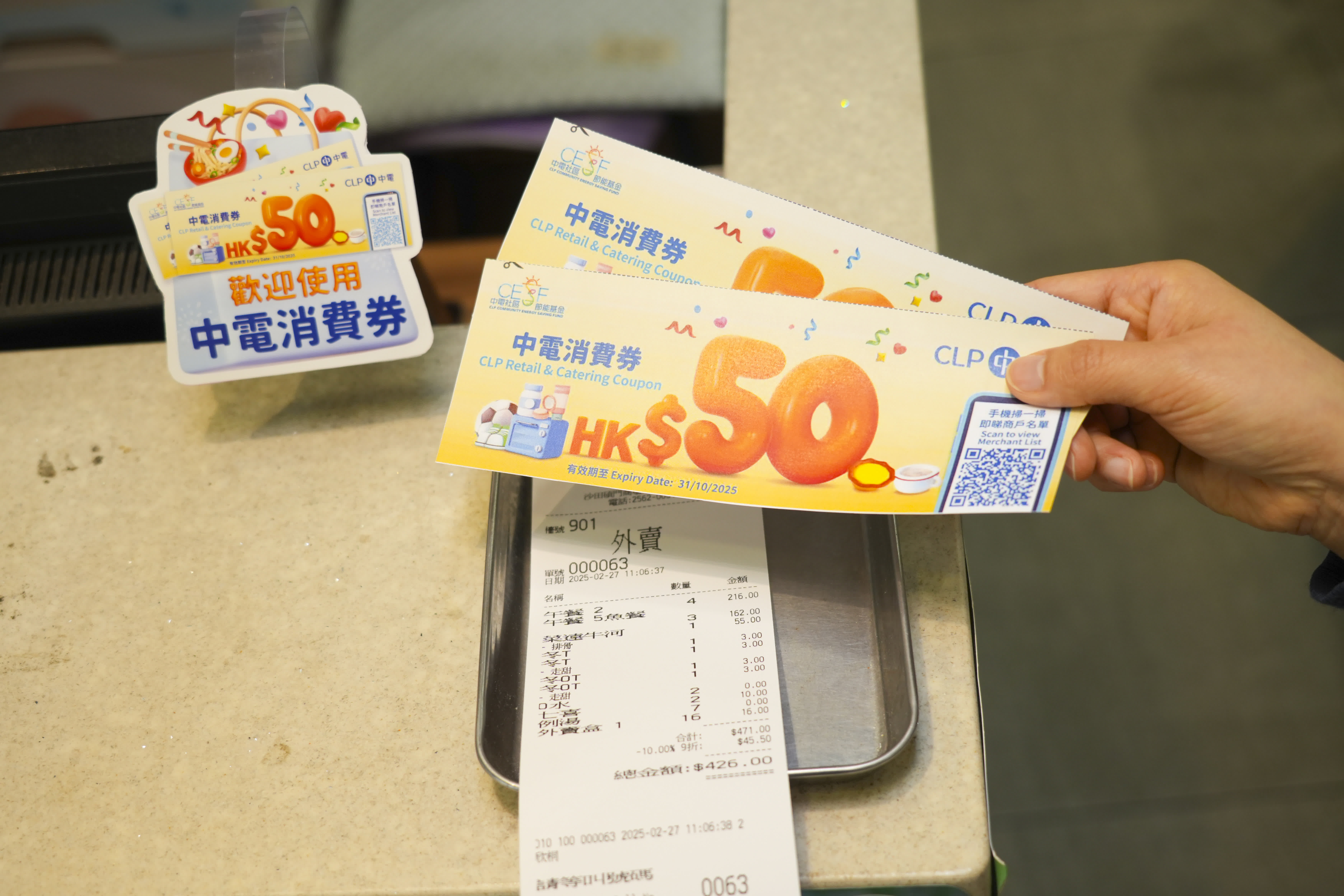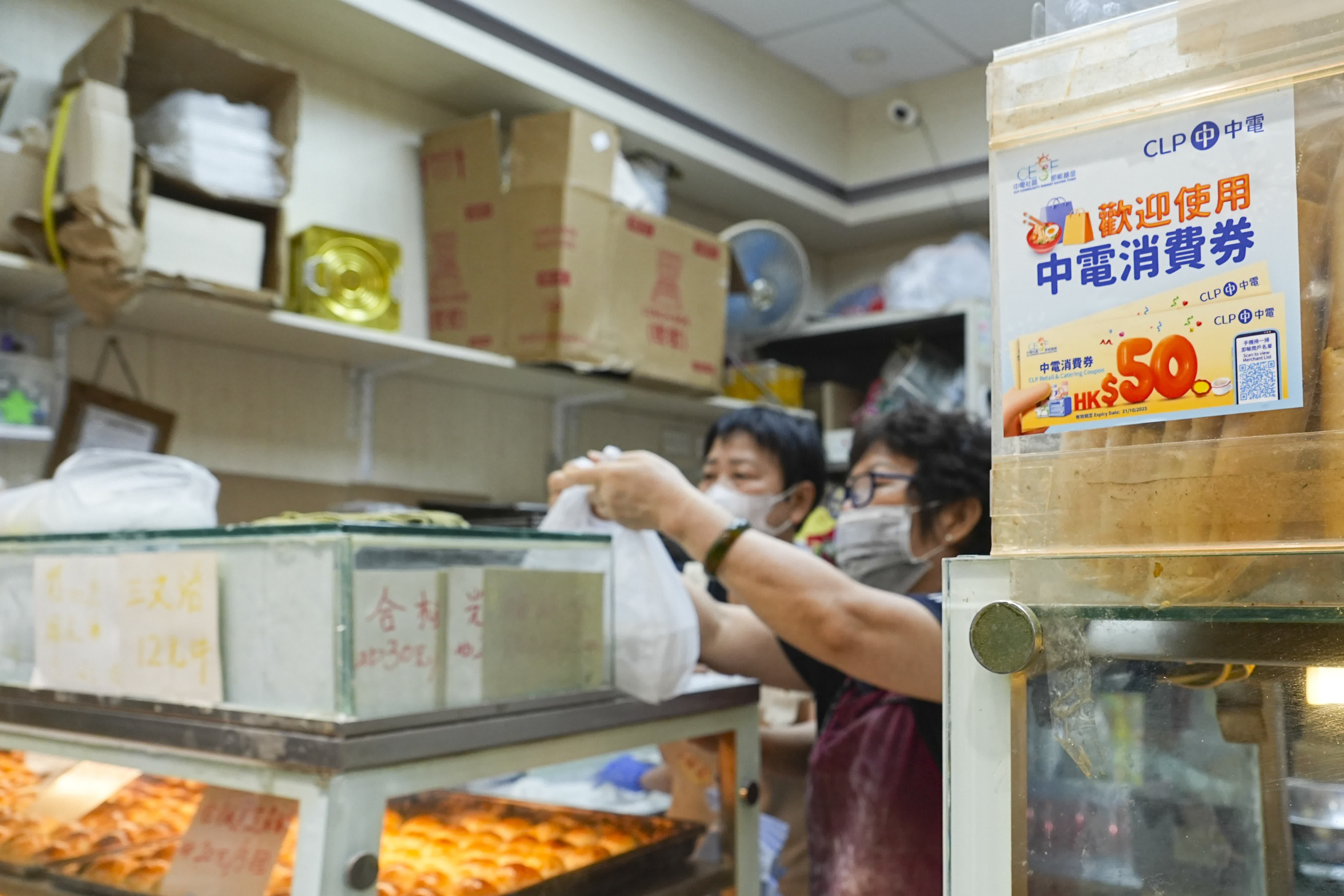 受惠家庭在四月中起已陸續收到兩張總值100港元的中電消費券,可於2025年10月31日或之前在參與計劃的零售商店和食肆使用。參與商戶會在店舖外張貼中電消費券計劃標貼,以茲識別。受惠人士亦可掃瞄消費券上的二維碼,或瀏覽計劃專頁 https://clp.to/coupon,查閱商戶名單。