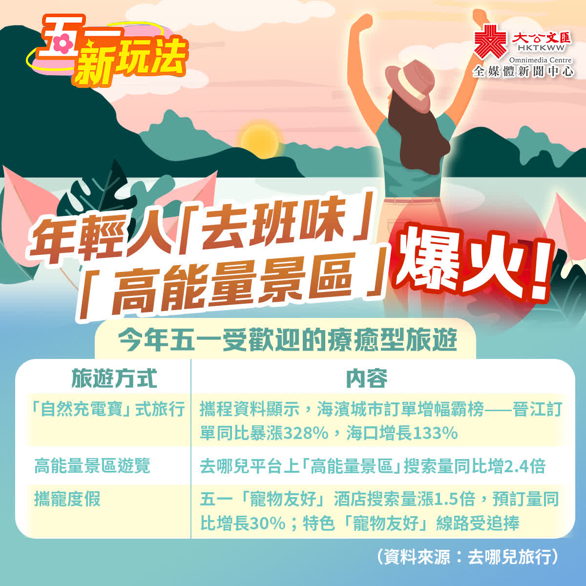 「充電式」旅遊在今年五一爆火。據了解,去哪兒平台上「高能量景區」搜索量同比增2.4倍。所謂「高能量」旅行,是區別於傳統的打卡式旅行,指在過程中通過環境、文化活動或周邊人群的積極影響,獲得精神振奮、情緒提升和能量恢復為目的的旅行。此外,根據去哪兒數據顯示,「高能量景區」「躺平」「攜寵度假」「電競酒店」是年輕用戶搜索量最高的熱詞。