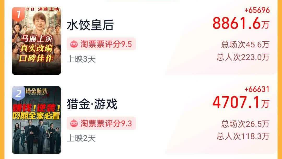 大公文匯網報道,據網絡平台數據,截至5月2日13時38分,2025年五一檔電影新片(含重映)總票房(含點映及預售)突破3億(人民幣),影片《水餃皇后》《獵金·遊戲》《雷霆特攻隊*》《人生開門紅》《幽靈公主》《蒼茫的天涯是我的愛》暫列前六。