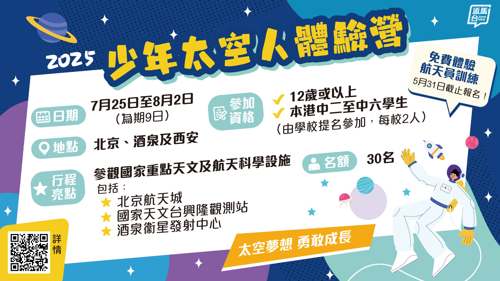 今年暑假舉行的「少年太空人體驗營2025」,現正接受全港中學提名學生報名參加,入選學員將免費到內地體驗航天員訓練,更有機會與航天員及航天專家會面交流,學習太空科學及天文知識,了解中國在航天科技發展取得的成就。