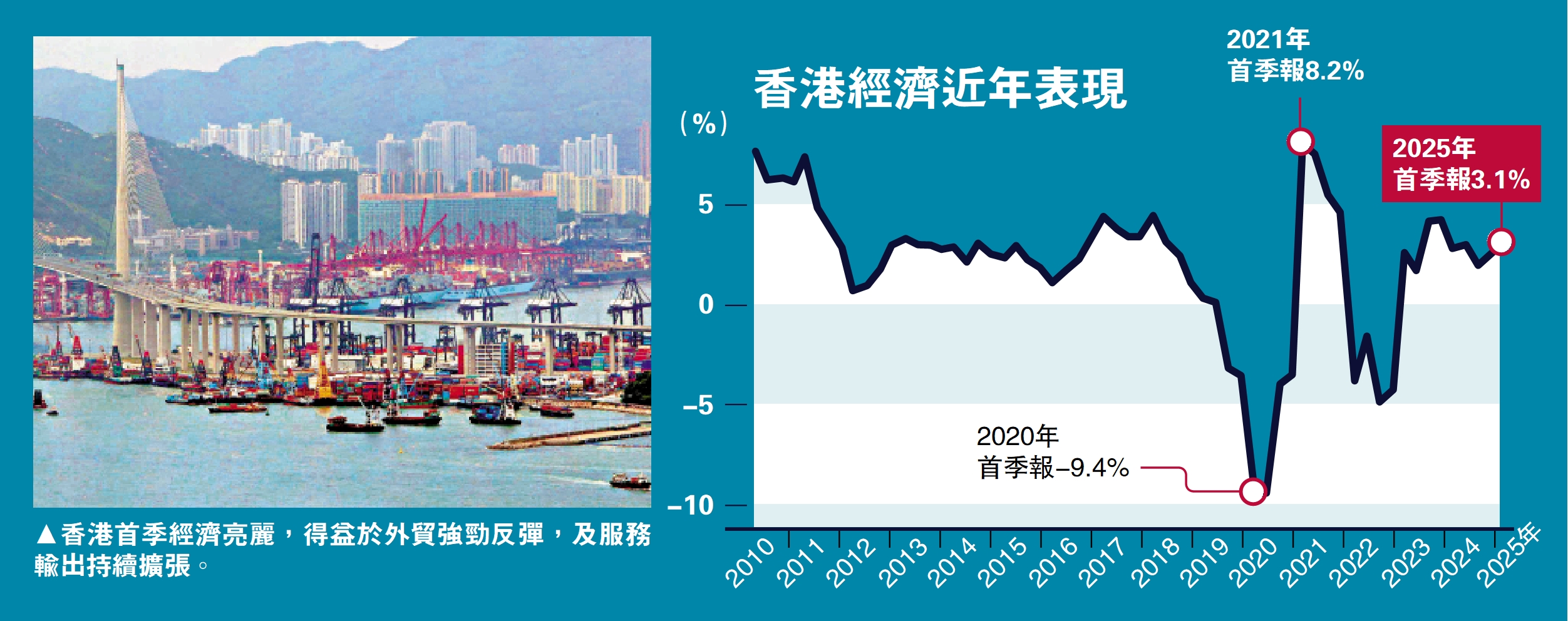 (大公報記者 李永青)香港經濟首季迎來「開門紅」,卻難掩美國關稅陰霾下的隱憂。特區政府昨日最新公布的數據顯示,今年第一季度本地生產總值(GDP)同比增長3.1%,不僅遠超市場預期的2.1%,也較去年第四季度2.5%的增速有所提升。香港首季經濟亮麗,主要得益於外貿的強勁反彈和服務輸出的持續擴張。