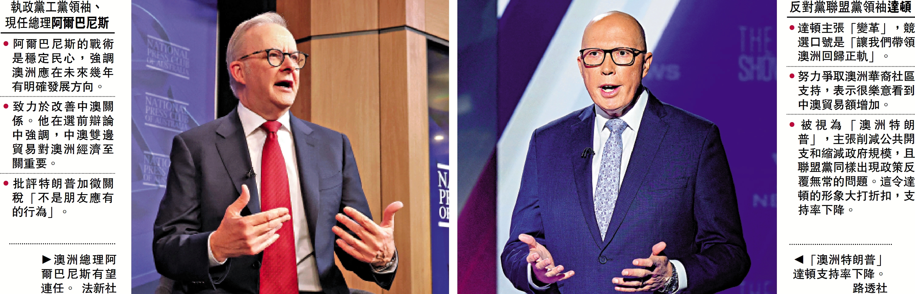 大公報綜合報道,澳洲3日舉行聯邦選舉,執政黨工黨領袖、現任總理阿爾巴尼斯民調支持率領先,有望成為2004年以來澳洲首位贏得連任的總理。澳媒指出,澳洲面臨生活成本危機和美國總統特朗普的關稅威脅,阿爾巴尼斯表現出的政策連貫性有助於安撫民心,而被視為「澳洲特朗普」的反對黨聯盟黨領袖達頓選情受到打擊。中國議題在本輪競選活動中出現頻率不高,雙方均主張盡一切可能發展中澳貿易關係。