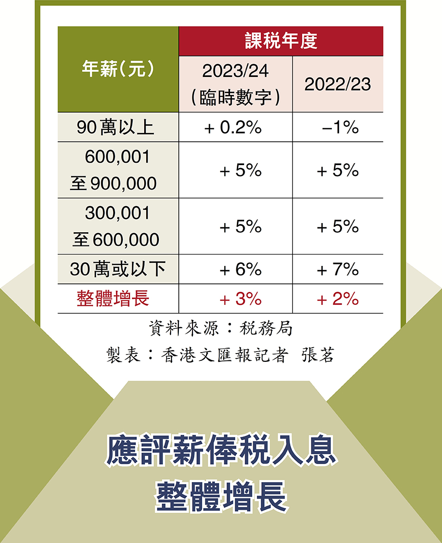 (香港文匯報記者 吳健怡)作為經濟晴雨表的特區政府稅收報捷!政府稅務局昨日宣布,已發出266萬份俗稱「綠色炸彈」的2024/25課稅年度個別人士報稅表,其中約79萬份為電子報稅表。受惠於各類輸入人才計劃,納稅人口連續第二年增加,今次發出的報稅表數量比去年多22萬份,並帶動2024/25年度各類收入,薪俸稅、印花稅、利得稅全線齊升,整體稅收按年度增一成達3,745億元。稅務局局長陳施維解釋,輸入人才計劃為香港帶來更多納稅人,他們的整體入息水平提高,並跌入稅網。展望2025/26年度預計稅收4,014億元,按年度增加7%,其中入息及利得稅3,012億元、印花稅676億元、其他稅收327億元。