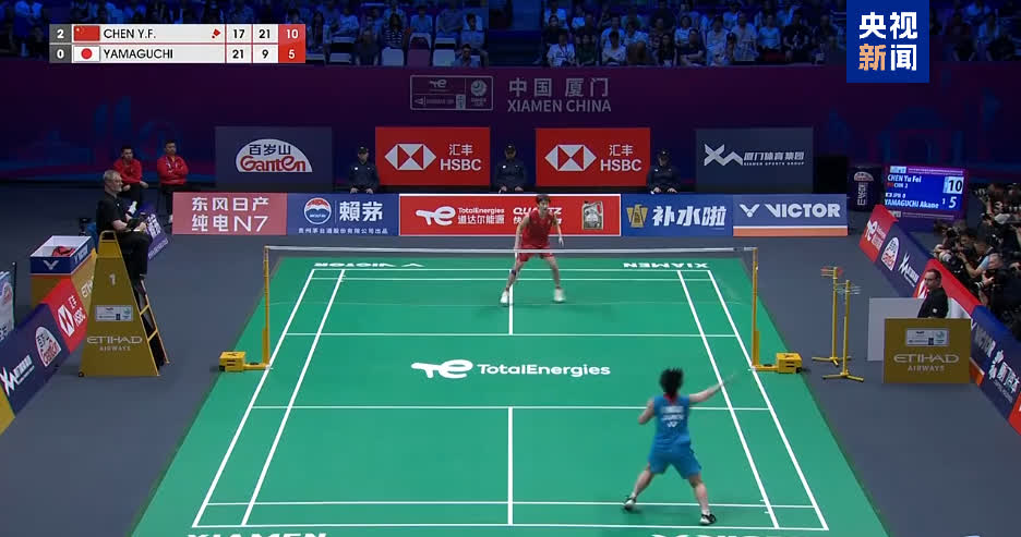 第三場女單比賽,陳雨菲苦戰三局,以17-21、21-9、21-16連扳兩局戰勝山口茜。