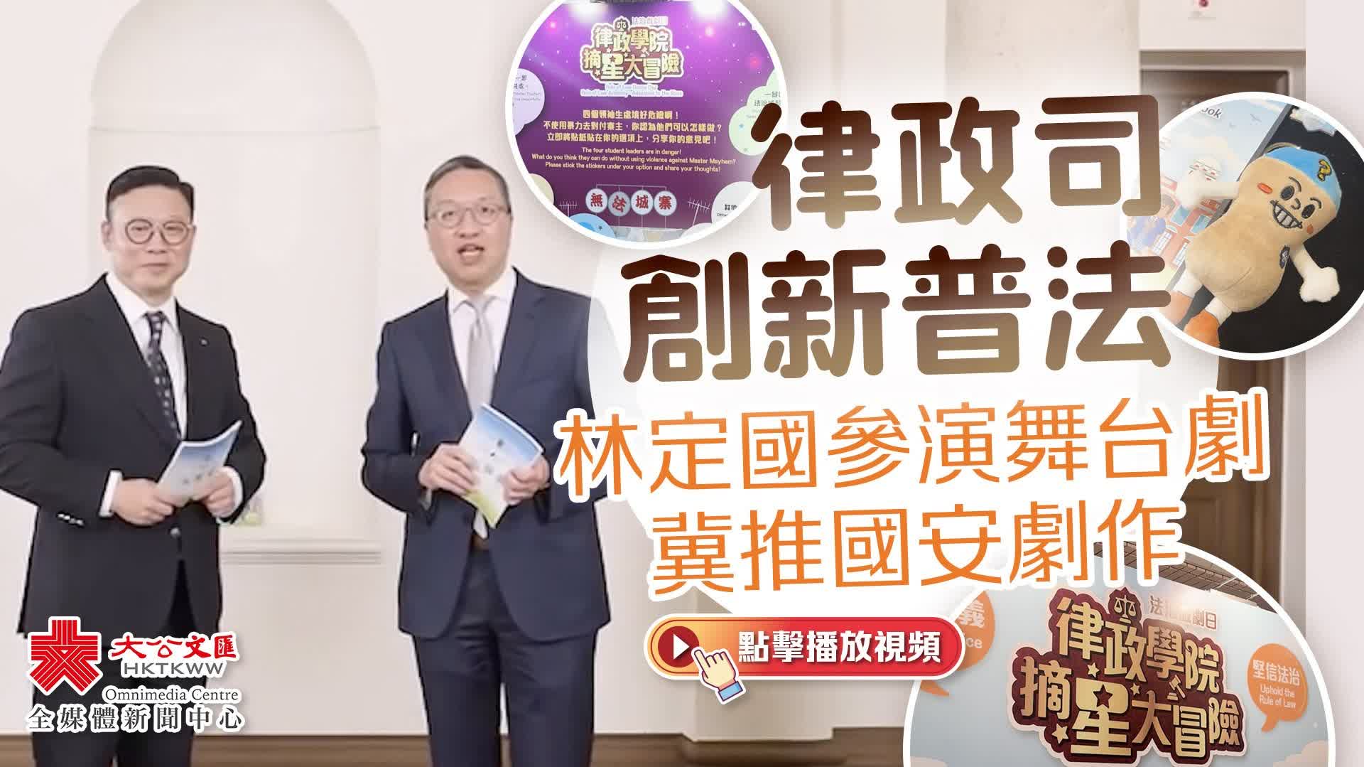 大公文匯全媒體報道,律政司今日(3日)首次以舞台劇形式推廣法治教育,在文化中心上演兩場原創法治戲劇《律政學院摘星大冒險》。活動今明兩日舉行,兩場演出預計吸引約2000名觀眾。律政司司長林定國與副司長張國鈞不僅擔任活動主禮嘉賓,更親身投入演出,分別飾演「保羅校長」與「張副校長」,帶領觀眾展開一場結合法律知識與互動體驗的冒險之旅。