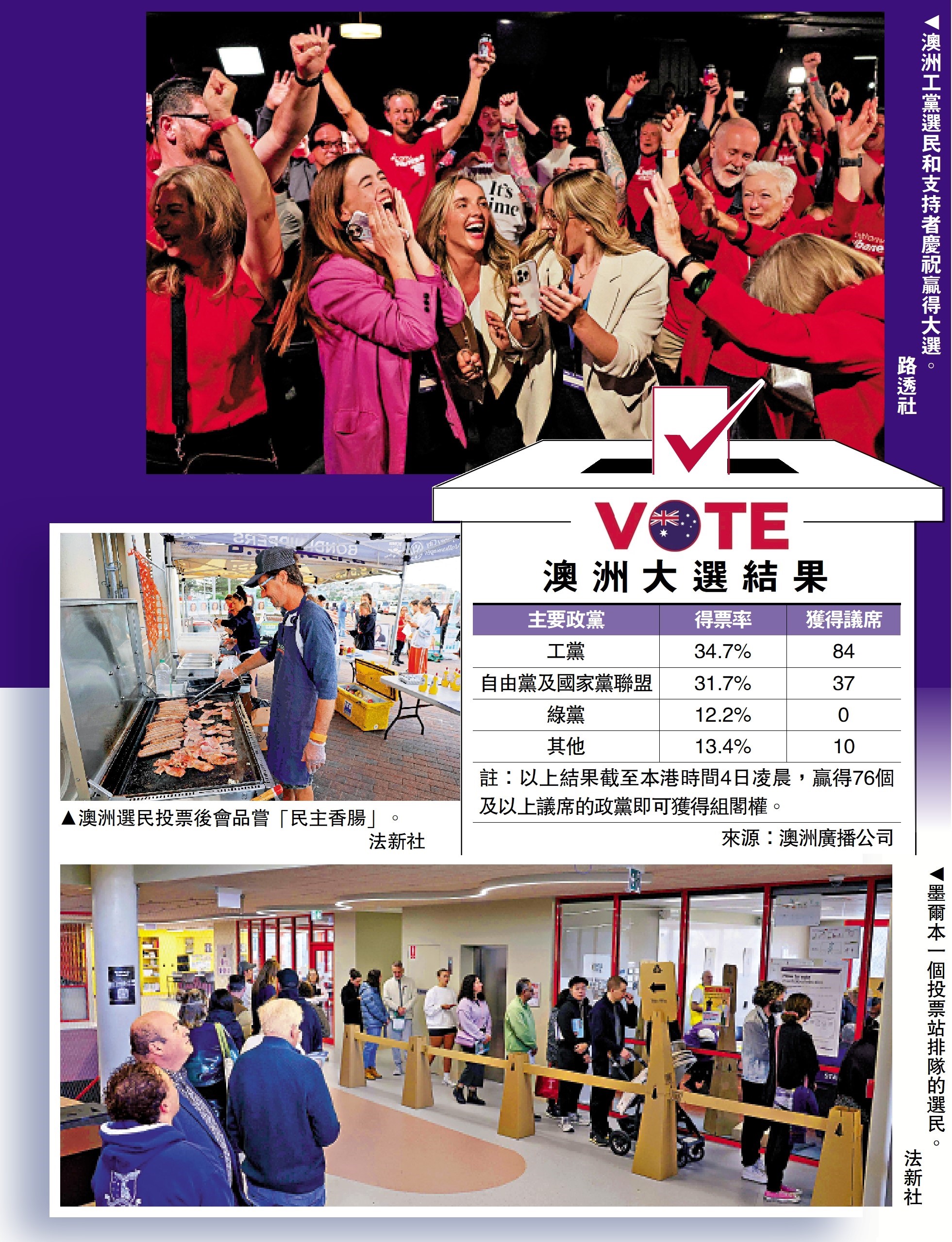 大公報綜合報道,澳洲3日舉行議會選舉,現任總理阿爾巴尼斯領導的執政工黨獲得眾議院超過半數議席,未來三年可單獨執政。阿爾巴尼斯成為2004年來首位成功連任的澳洲總理。