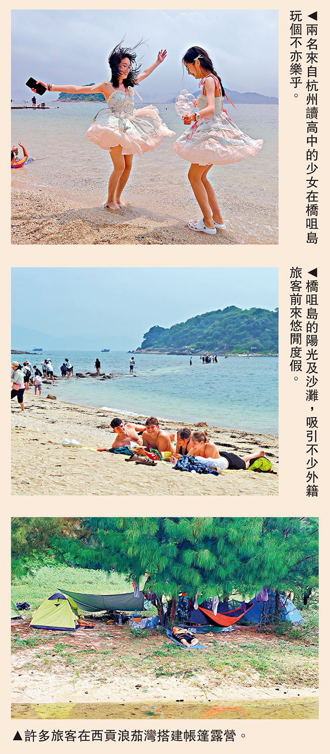 在西貢的橋咀島和東壩,黃金周開展以來,到處是打卡和縱情山水的內地遊客。有遊客大讚香港無處不旅遊,不但是美食、購物天堂,更是深度遊好地方,幾乎每月都來行山露營,香港的名山景點幾已行遍。有家庭客指趁黃金周來香港小住3、4日,隨處走走,行山看海,不包購物,預計每人花費約5000元。多元化的旅遊模式,讓這個黃金周的香港格外精彩,商家丁財兩旺,旅客盡興而歸。