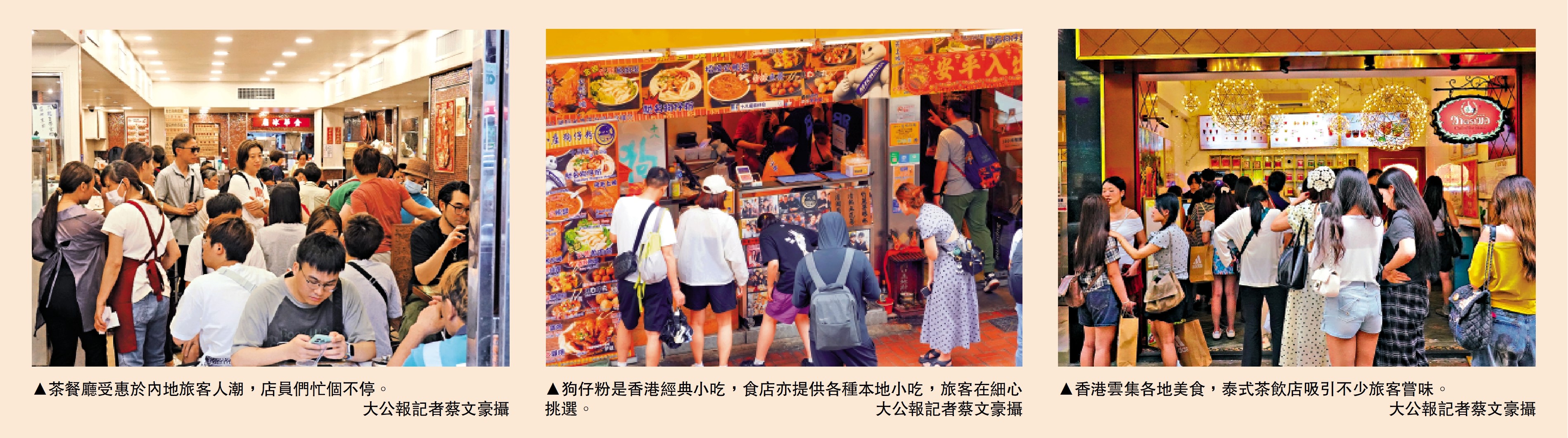 大公報記者昨日走訪旺角和尖沙咀,大街小巷的餐廳人潮湧動,有不少旅客光顧,部分網紅餐廳在非繁忙時間,食客亦絡繹不絕。茶餐廳、冰室及香港街頭小吃,備受旅客歡迎。