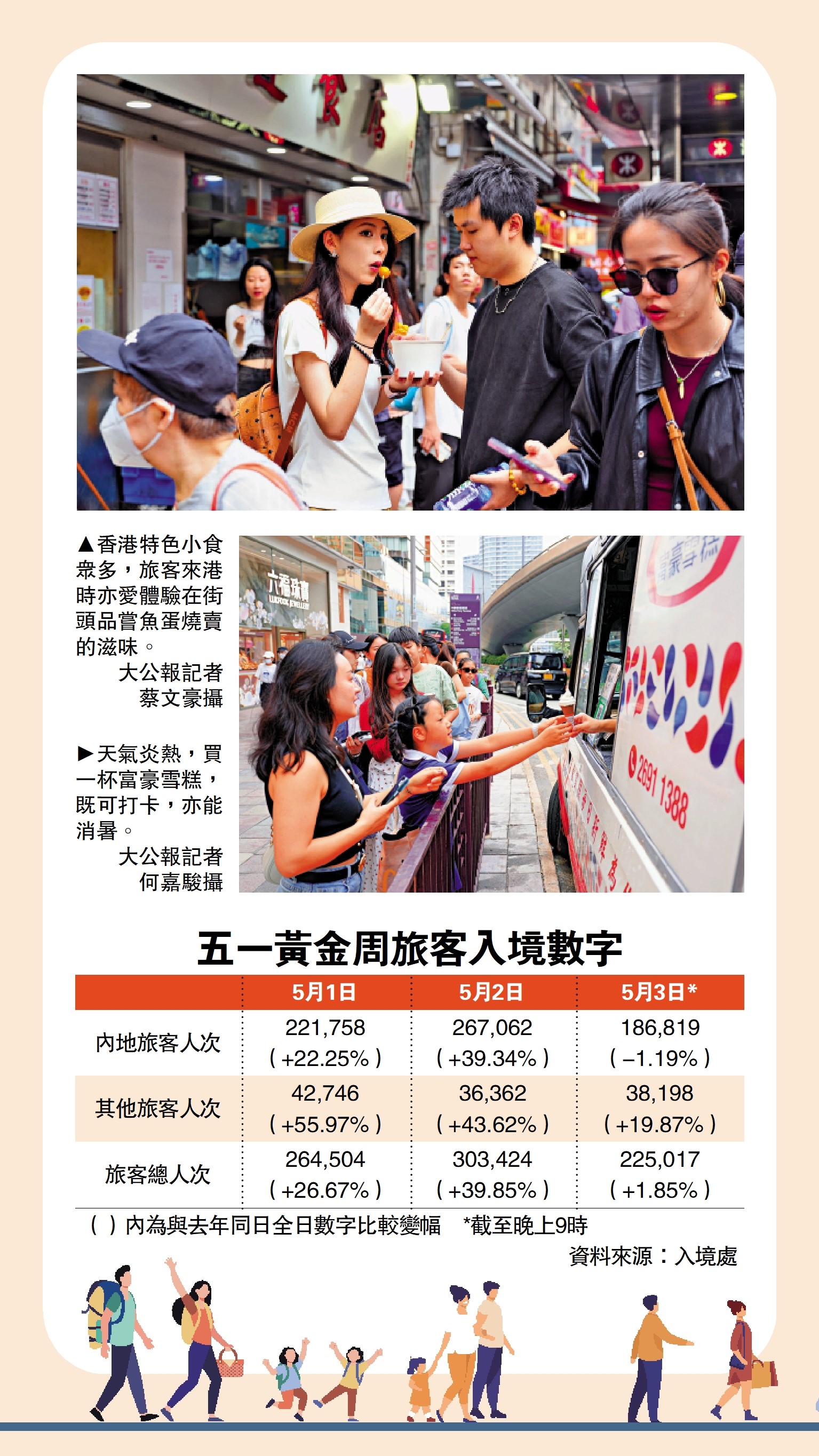 (大公報記者 易曉彤 劉碩源)五一黃金周過去三日,香港迎來共約79.3萬旅客,當中八成是內地旅客,共約67.6萬人次。餐飲市場尤其火爆,茶餐廳、港式小食攤生意滔滔,有小紅書網紅推介的餐廳在非繁忙時段都排起人龍,有推車仔點心的中式酒樓指黃金周內地客增近三成。