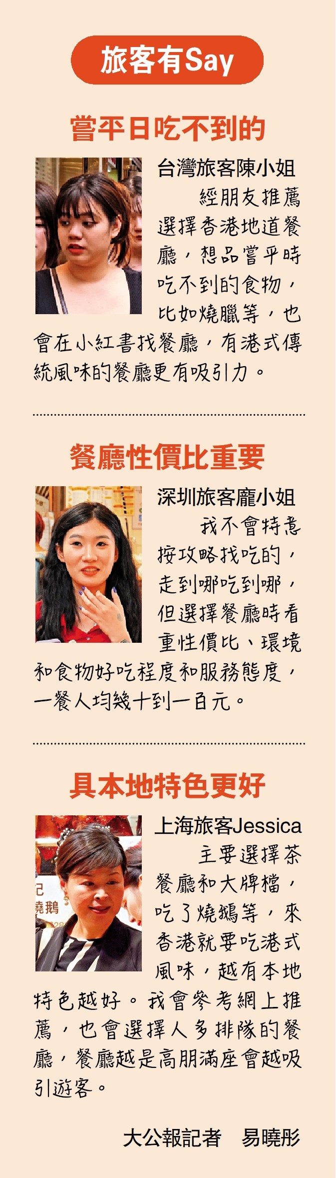 獲內地旅客青睞的餐廳普遍是提供港式特色美食,他們善用小紅書、大眾點評等應用程式,挑選網紅餐廳,追求港味,不計較價錢平貴。有餐廳提前在社交平台推廣,成功吸客,將人氣變財氣。有餐飲業人士表示,雖然港式美食受內地旅客追捧,但認為不同食肆應該各自發揮優勢及強項,發揮香港多元美食文化的特色。