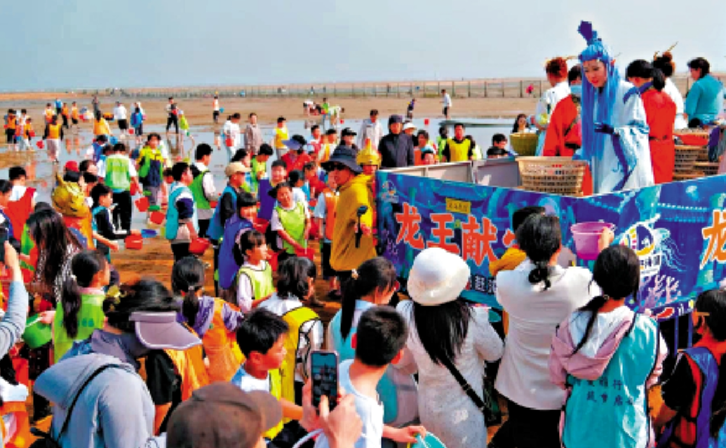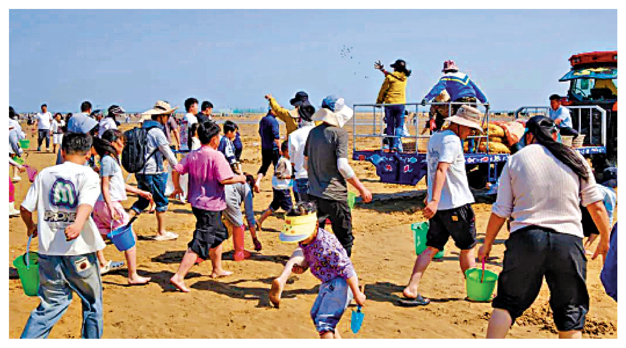 在山東日照,寫有「龍王獻寶」字樣的皮卡車駛過灘塗,「龍王」敖丙和幾個小龍女「天女散花」般向四方撒下蛤蜊,車後的遊客笑着、跑着,拎着小桶在地上撿拾。五一期間,每天下午2:30-4:30,日照劉家灣趕海園將3000斤蛤蜊灑落在灘塗上,讓遊客放開撿蛤蜊,為的是滿足遊客來日照「趕海」(指在退潮的海灘上拾撿貝類)挖蛤蜊的情緒價值。「不許趕海遊客挖不到蛤蜊」,趕海園變成了狂歡現場。