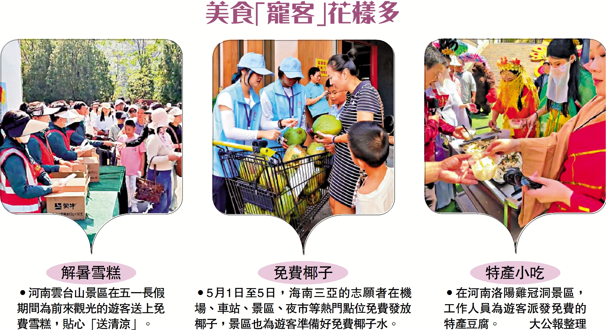 (大公報記者 丁春麗 濟南報道)西瓜免費吃、涼粉一元購……五一假期,內地掀起旅遊狂潮。各地景點為了讓遊客放心吃、開心玩,祭出各種「花式寵客」的創意服務,紛紛把遊客寵上了天,主打「來了就盡興」。
