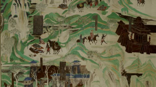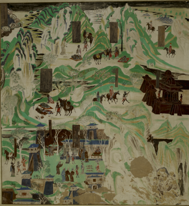 《佛頂尊勝陀羅尼經變佛陀波利史跡畫》是「敦煌守護神」常書鴻於1955年臨摹創作的,畫面依據佛陀波利譯《佛頂尊勝陀羅尼經》序文繪製,記述了罽賓國僧人佛陀波利翻譯《佛頂尊勝陀羅尼經》的緣由。畫面中山水以線條勾勒輪廓,青綠重彩,應是畫史記載的青綠山水畫法,描繪山清水秀的五台山情景,給人一種心曠神怡的視覺效果。潘義奎副館長介紹說莫高窟這幅壁畫的青綠山水畫法比王希孟的《千里江山圖》還要早幾百年。