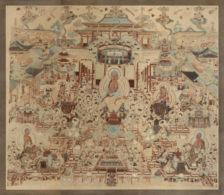 《觀無量壽經變》是常沙娜先生在15歲時臨摹的一幅較大的作品。盛唐172窟為覆鬥頂窟,窟室南北壁各畫觀無量壽經變一鋪。此次展示的摹本源自此窟南壁,臨摹時已將變為深色的人物膚色恢復到應有原色。畫面中殿閣層疊,人物眾多,氣氛歡快而熱烈,充分顯示出佛陀的莊嚴、菩薩的柔美、伎樂的歡快、極樂世界的殊勝美好。這幅作品不但具有藝術性,也擁有高度的考古與研究價值,可供世人研究壁畫風化前後的區別。常沙娜希望透過作品的呈現,提醒更多人共同理解與認識敦煌美學藝術。