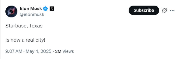 太空探索技術公司首席執行官埃隆·馬斯克在社交媒體發文:「得克薩斯的星艦基地,現在是一座真正的城市了!」