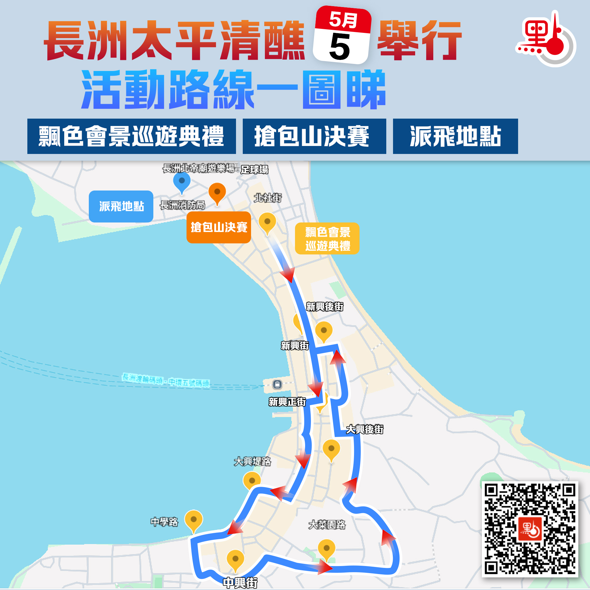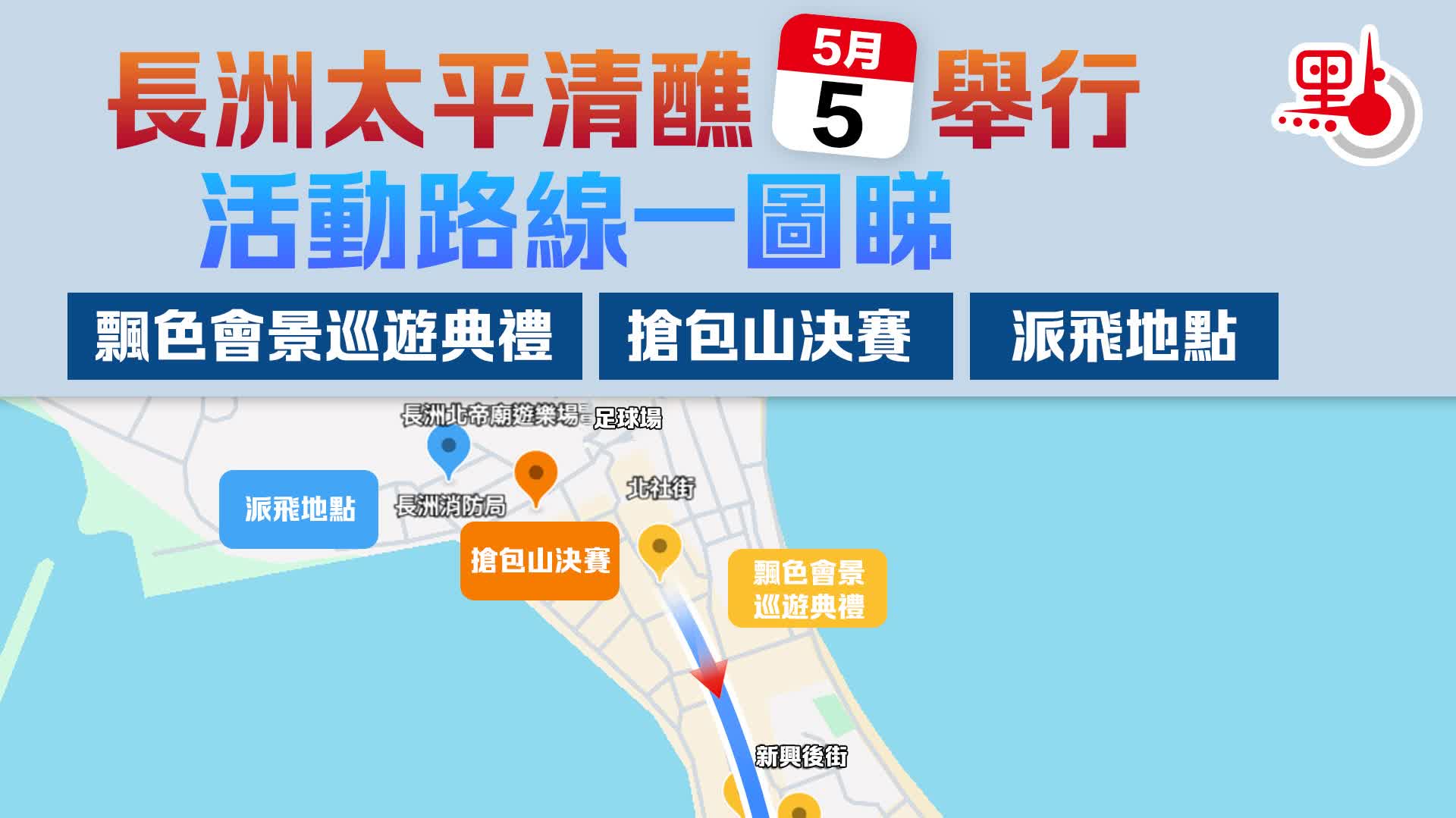 大公文匯全媒體報道,內地五一黃金周一連五天假期,大批內地旅客湧港,而一年一度的長洲太平清醮飄色會景巡遊及「搶包山決賽」明日(5月5日)舉行。大公文匯全媒體特別製作長洲太平清醮活動路線圖,令你一圖了解飄色會景巡遊典禮、派飛地點及搶包山決賽三大重要活動訊息!