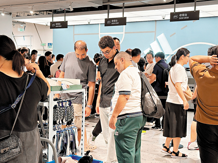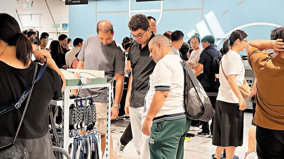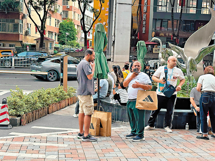 走出廣交會,到廣州的各大商圈,處處都像廣交會「分會場」,不少外國人扎堆消費。4日,與廣交會展館均處於海珠區的萬國奧特萊斯商城門口,人頭攢動。香港文匯報記者還沒擠進去商場門口,就看到提着大袋小袋「戰利品」的外國人笑容滿面地走出來。在商城裏的一間阿迪達斯品牌服裝店,店員小陳忙碌地整理貨架,不時跟一些外國人溝通,拿出他們想要的碼數。「這半個月多了很多外國客人,對我們的英語水平也是種鍛煉。」她笑說,不少來購物的外國人都是參加廣交會的採購商,均來自不同國家。