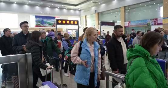記者在琿春口岸入境大廳看到,一波又一波俄羅斯遊客正攜帶行李有序排隊,由工作人員引導辦理入境相關手續,在口岸各聯檢部門密切配合下,短短几分鐘便完成了通關。
