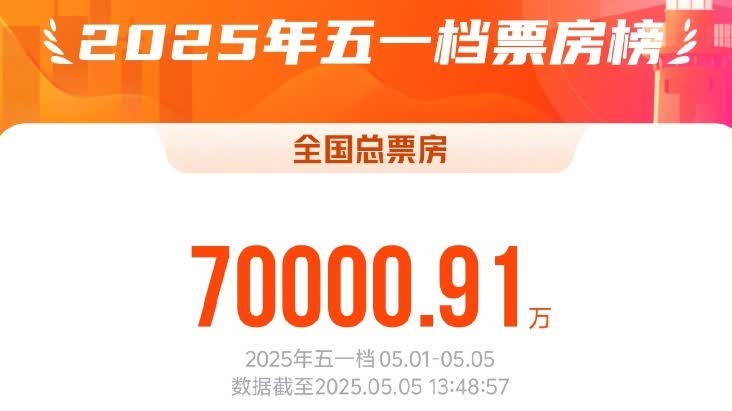 大公文匯網報道,據網絡平台數據,截至5月5日13時48分,2025年五一檔(5月1日-5月5日)檔期內總票房突破7億(人民幣),影片《水餃皇后》《獵金·遊戲》《幽靈公主》暫列前三名。