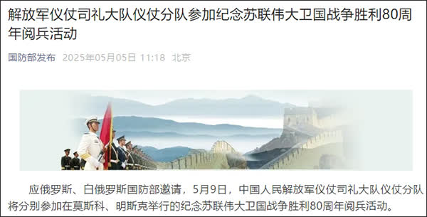 據微信公眾號「國防部發布」5月5日消息,應俄羅斯、白俄羅斯國防部邀請,5月9日,中國人民解放軍儀仗司禮大隊儀仗分隊將分別參加在莫斯科、明斯克舉行的紀念蘇聯偉大衛國戰爭勝利80周年閱兵活動。