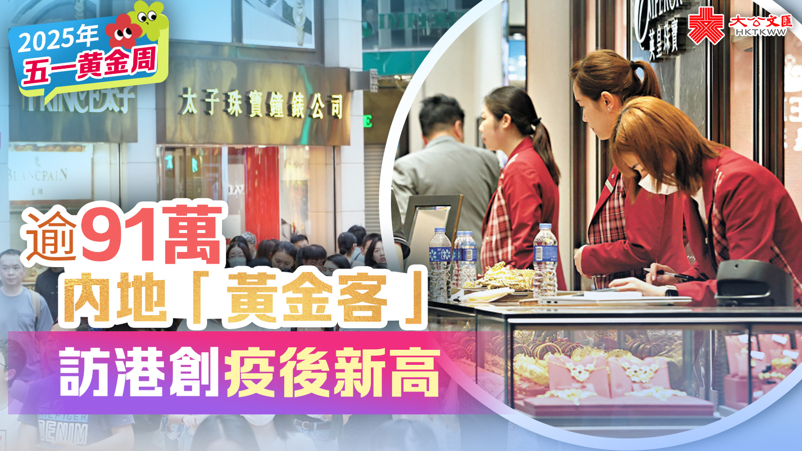 (香港文匯報記者 王僖)內地五一黃金周昨日結束,今年趁一連5天假期來港的內地旅客人數創疫後新高,截至昨晚9時,5天共錄得91.3萬內地旅客人次來港,超出去年5日76.6萬內地旅客的總和,且丁財兩旺,不少旅客趁昨日假期最後一天,離港前特意到尖沙咀購買金飾,有金舖昨晨未營業已有旅客排隊等候開門,珠寶金飾業界人士指今個黃金周生意額較去年同期升逾三成,零售、餐飲界均表示營業額較去年上升,化妝品及海味銷售亦有近三成升幅,形容對疲弱的零售市道是強心針。