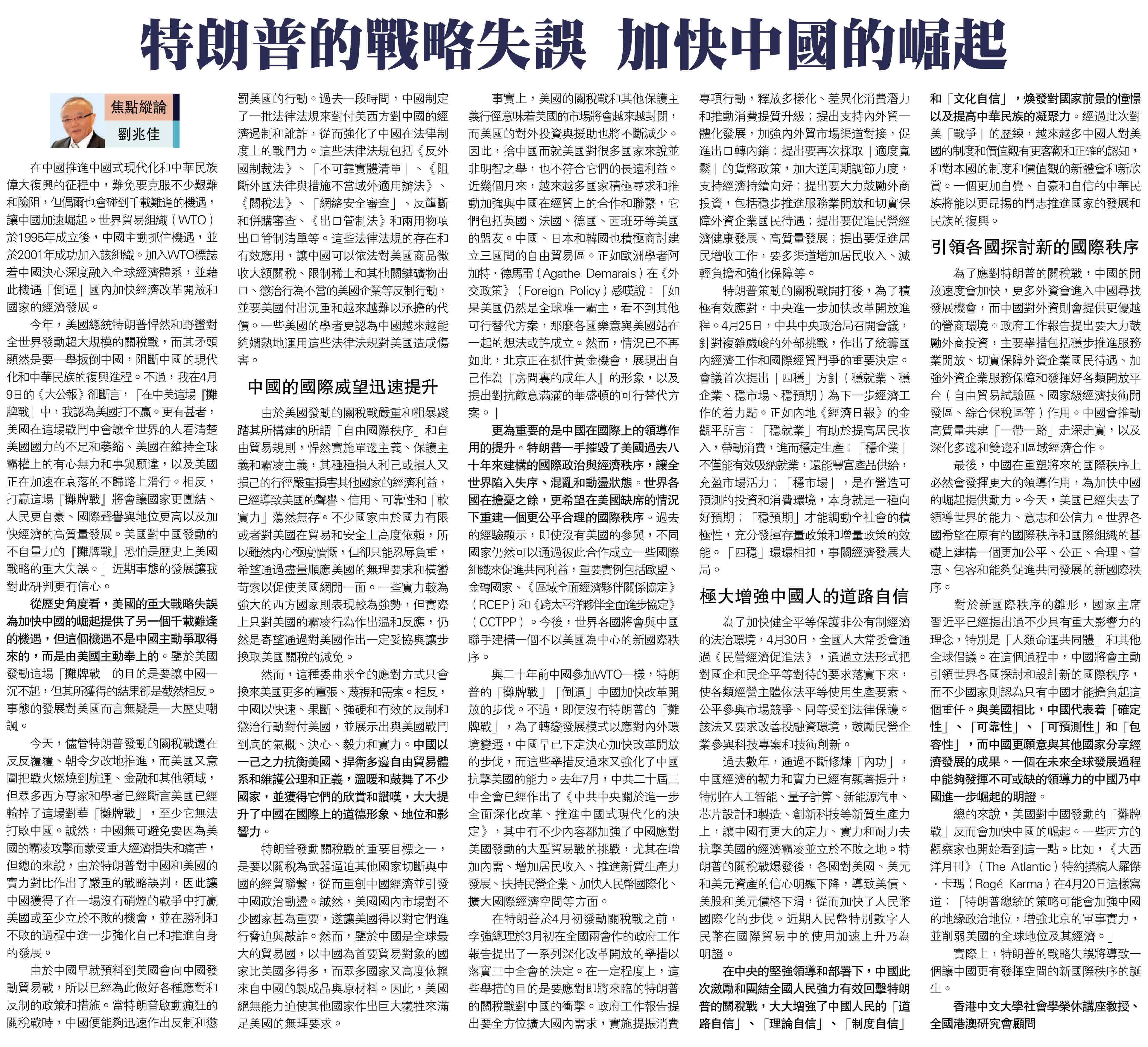 更為重要的是中國在國際上的領導作用的提升。特朗普一手摧毀了美國過去八十年來建構的國際政治與經濟秩序,讓全世界陷入失序、混亂和動盪狀態。世界各國在擔憂之餘,更希望在美國缺席的情況下重建一個更公平合理的國際秩序。過去的經驗顯示,即使沒有美國的參與,不同國家仍然可以通過彼此合作成立一些國際組織來促進共同利益,重要實例包括歐盟、金磚國家、《區域全面經濟夥伴關係協定》(RCEP)和《跨太平洋夥伴全面進步協定》(CCTPP)。今後,世界各國將會與中國聯手建構一個不以美國為中心的新國際秩序。