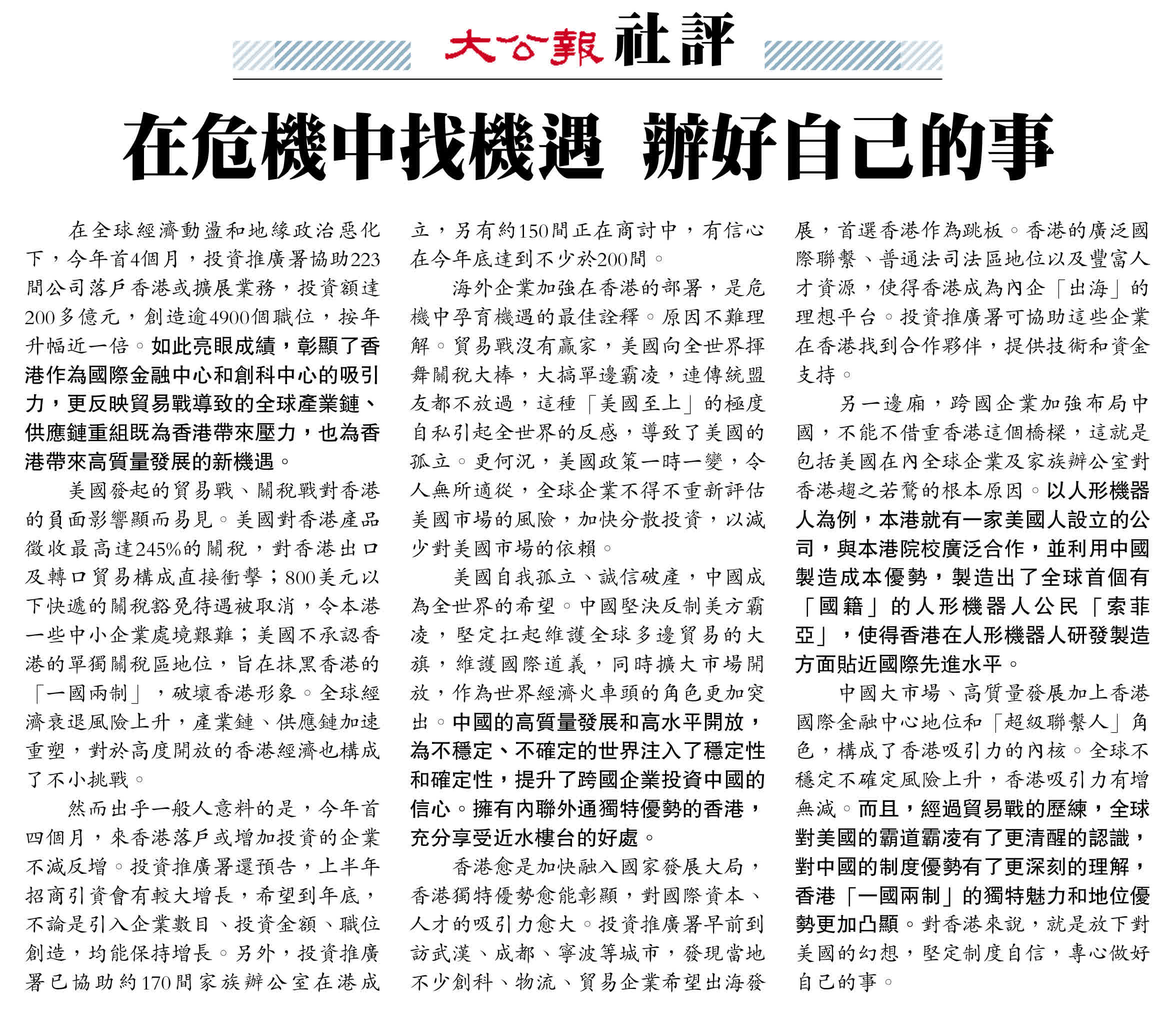在全球經濟動盪和地緣政治惡化下,今年首4個月,投資推廣署協助223間公司落戶香港或擴展業務,投資額達200多億元,創造逾4900個職位,按年升幅近一倍。如此亮眼成績,彰顯了香港作為國際金融中心和創科中心的吸引力,更反映貿易戰導致的全球產業鏈、供應鏈重組既為香港帶來壓力,也為香港帶來高質量發展的新機遇。