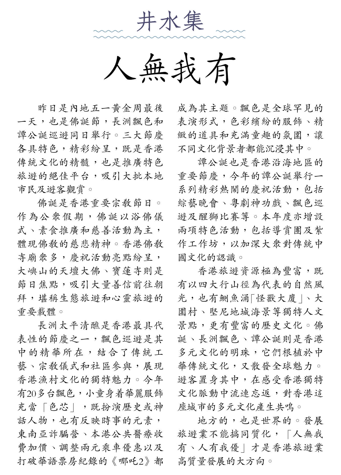 昨日是內地五一黃金周最後一天,也是佛誕節,長洲飄色和譚公誕巡遊同日舉行。三大節慶各具特色,精彩紛呈,既是香港傳統文化的精髓,也是推廣特色旅遊的絕佳平台,吸引大批本地市民及遊客觀賞。