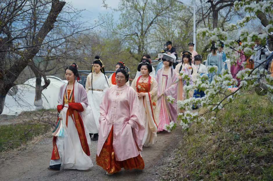 蓮花山生態旅遊度假區的百年梨園正迎來梨樹盛花期,潔白的梨花競相綻放,將梨園裝點成一片夢幻的花海。假日裏,吉林省第三屆漢服花朝遊園會暨長春蓮花山梨園漢服文化季在此華麗上演,近百名漢服愛好者帶來國風花神巡遊,為百年梨園增添了一抹古韻。家住長春市寬城區的徐薇特意開車前來賞花,「在這裏欣賞梨花,與在市區的感受截然不同,給人帶來一種寧靜悠遠的田園之美。」徐薇說,她和家人打算利用假期再去一趟天定山旅遊度假區體驗露營,享受悠閑的戶外時光。