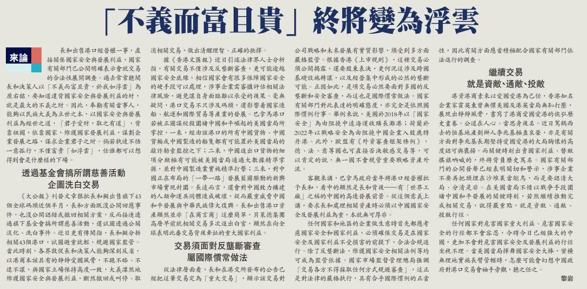 大公報獨家觀察。針對長和出售港口經營權一事,《大公報》今日發表署名評論文章指,事件直接關係國家安全與發展利益,國家有關部門已公開明確表示會就交易的合法性展開調查。過去常常聽聞長和決策人以「不義而富且貴,於我如浮雲」為座右銘,要知道違背國家安全與發展利益的財,就是最大的不義之財。因此,奉勸有關當事人,能夠以民族大義為立世之本,以國家安全與發展利益為經世之道,「君子愛財,取之有道」。點擊閲讀詳情