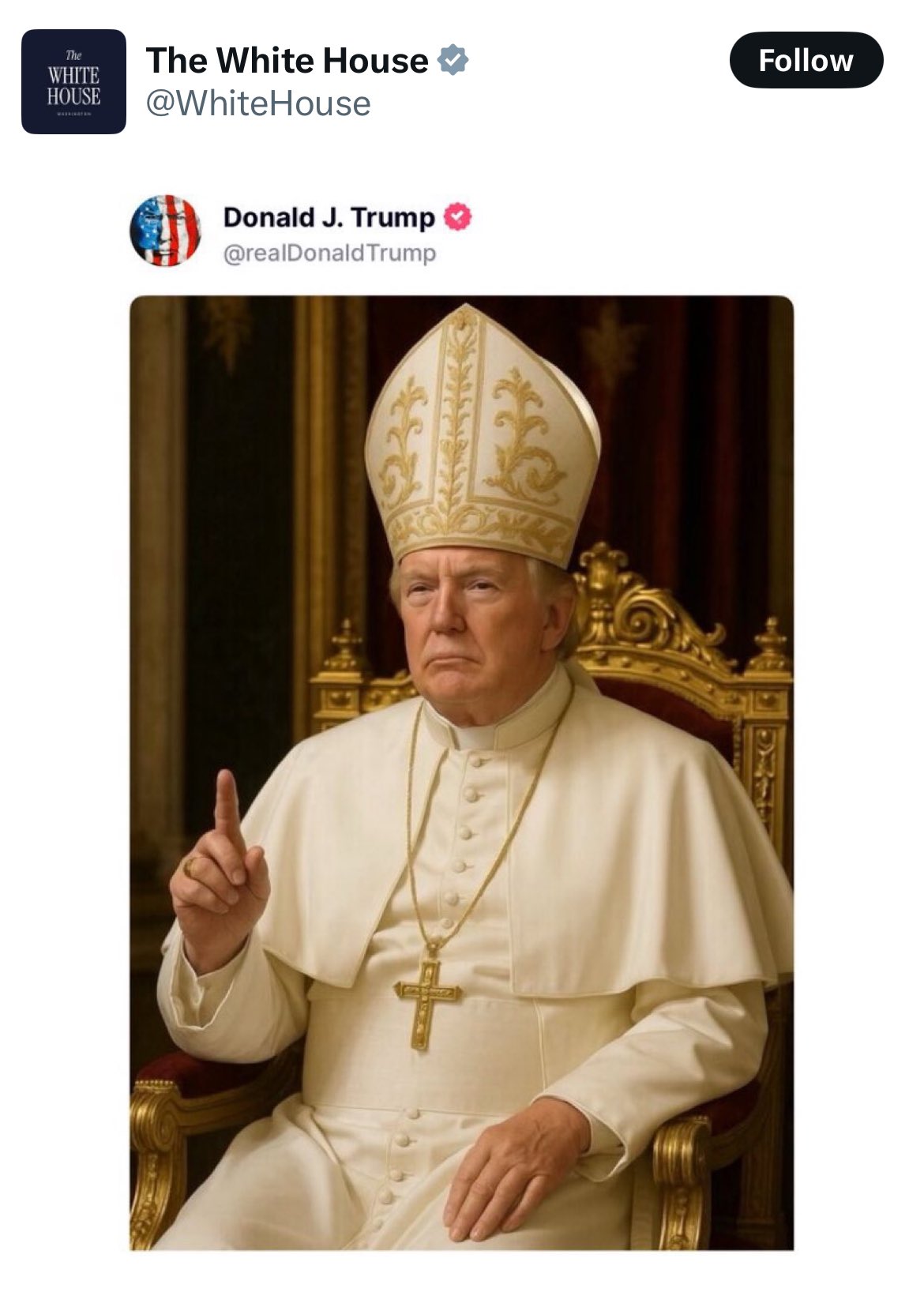 大公文匯全媒體報道,曾發表「我想做教宗,那是我第一選擇」言論的美國總統特朗普,早前在自己的社交媒體上發布一張AI合成照片,疑似為滿足自己的「教宗夢」。畫面中他身穿教宗白袍、戴上主教帽,胸前掛着十字架,右手指天。該AI圖在他本人的社交平台首次曝光後,亦被白宮的官方社交平台賬號轉載。