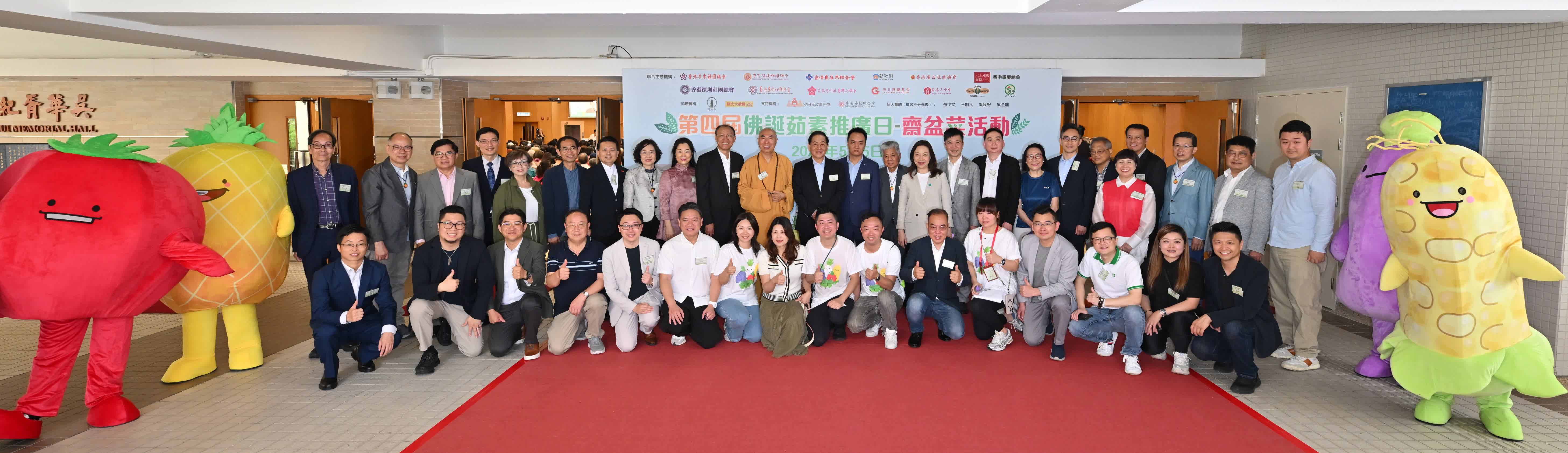 隨後,大會頒發了感謝狀,各位主禮嘉賓一同上台進行「第四屆佛誕茹素推廣日」啟動儀式。各位主禮嘉賓將代表陽光、水分、泥土、愛心和希望的五種元素一同注入儀式道具中,希望匯聚善心力量,讓素食文化傳遞的美善品德在香港茁壯成長、代代傳承。儀式結束後,大家一起享用齋盆菜,大會亦準備了蔬果福袋派贈給現場市民,希望共同為香港祈福,為社會和諧安定貢獻力量。