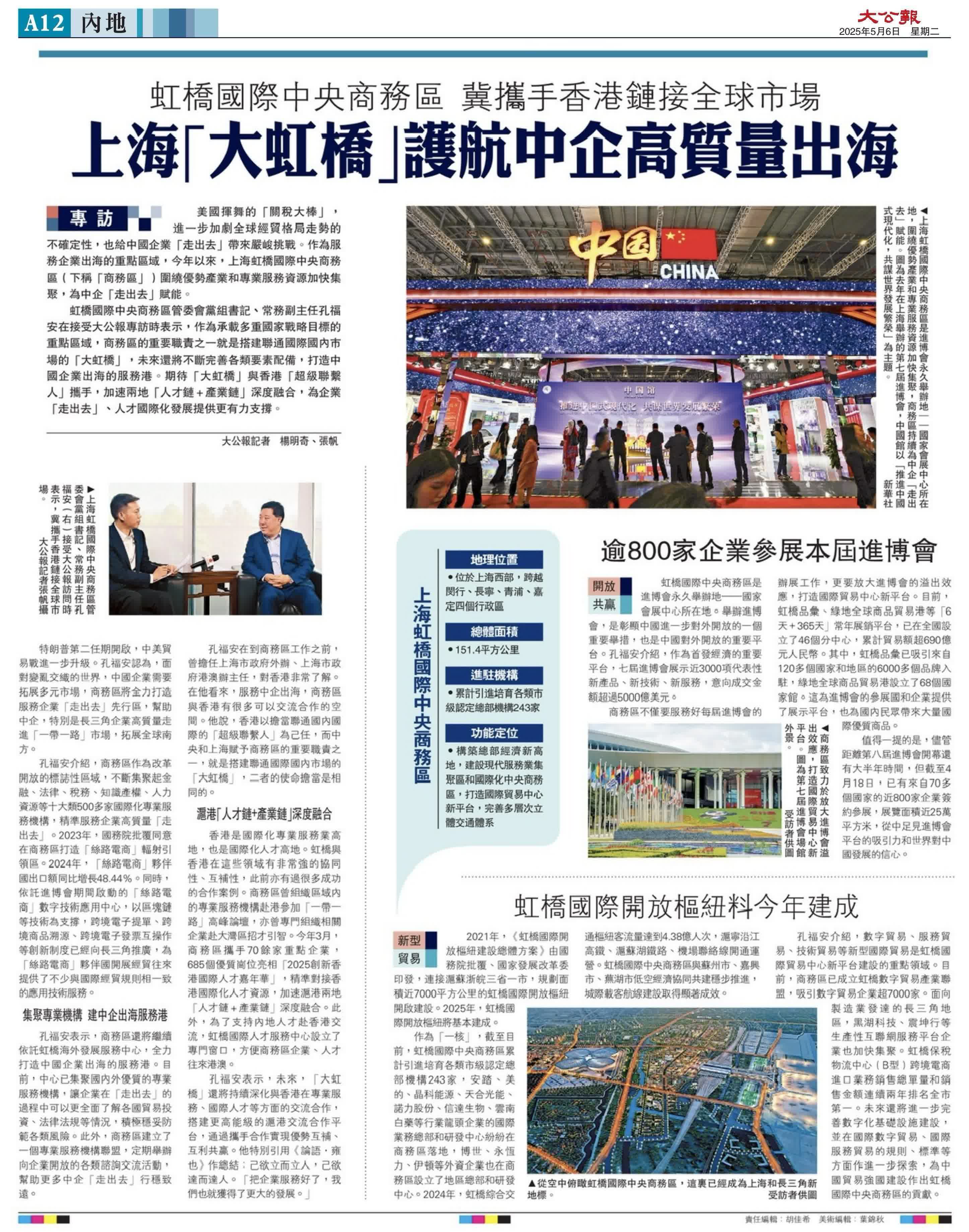 (大公文匯網記者楊明奇、張帆上海報道):美國揮舞的「關稅大棒」,進一步加劇全球經貿格局走勢的不確定性,也為中國企業「走出去」帶來新的嚴峻挑戰。作為服務企業出海的重點區域,上海虹橋國際中央商務區今年以來圍繞優勢產業和專業服務資源的加快集聚,為中企「走出去」提供更大賦能。虹橋國際中央商務區管委會黨組書記、常務副主任孔福安在接受大文記者專訪時表示,作為承載多重國家戰略目標的重點區域,商務區的重要職責之一就是搭建聯通國際國內市場的「大虹橋」,未來還將不斷完善各類要素配備,打造中國企業出海的服務港。期待「大虹橋」與香港「超級聯繫人」攜手,加速兩地「人才鏈+產業鏈」深度融合,為企業「走出去」、人才國際化發展提供更有力支撐。