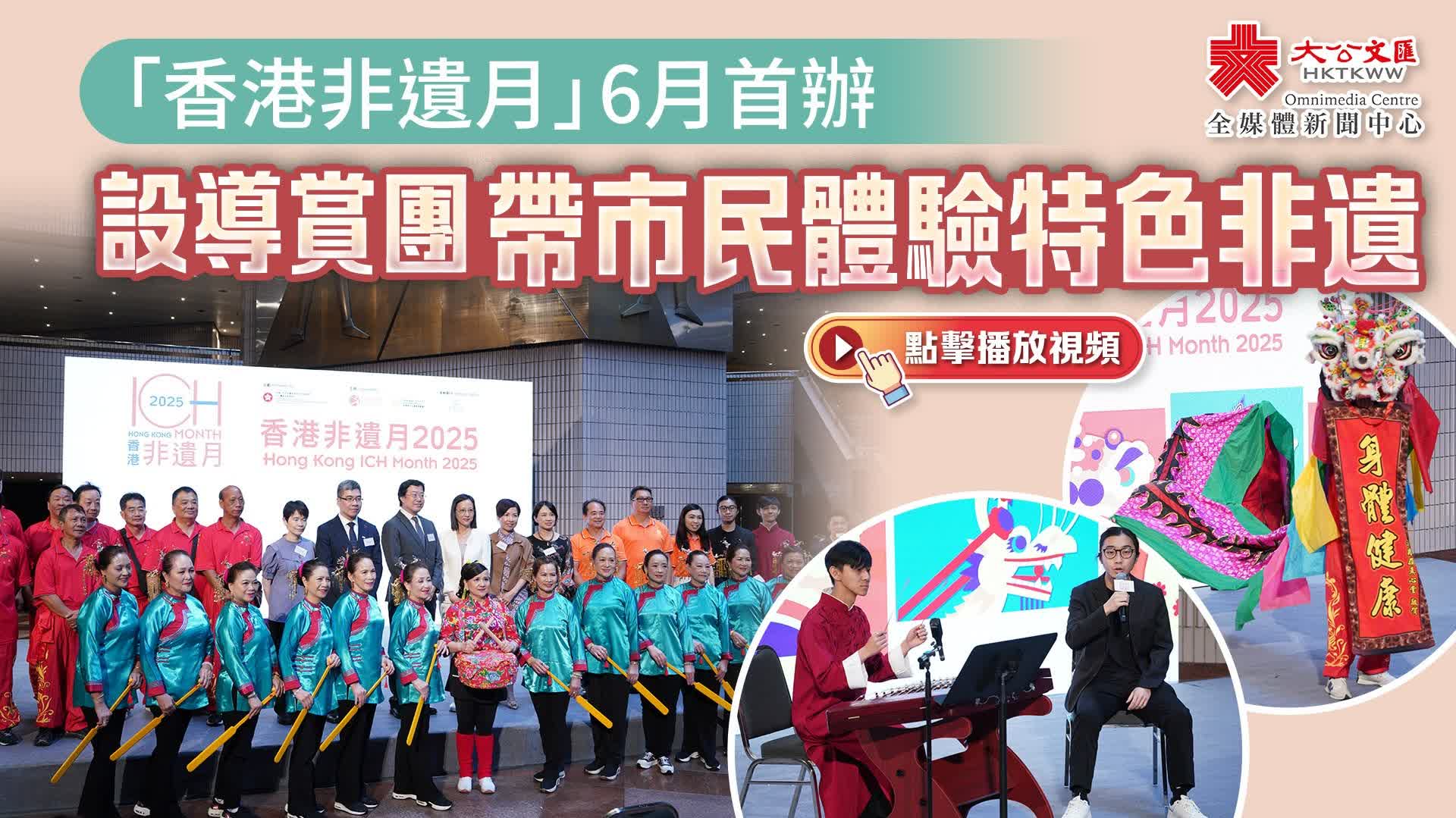 (大公文匯全媒體 記者 鄭洢林)康文署非遺辦將於6月主辦首屆「香港非遺月」,以「香港處處有非遺」為主題,推出一系列豐富多元活動,加深大眾對非遺的認識。活動涵蓋超過80場非遺表演、60個互動體驗攤位及20個「非遺精華遊蹤」導賞團,涉及超100項香港及內地非遺項目,提升市民及旅客對香港及內地非遺的認識,親身感受非遺的文化內涵和樂趣。屆時所有活動均免費開放,預計吸引逾10萬市民及旅客參與。