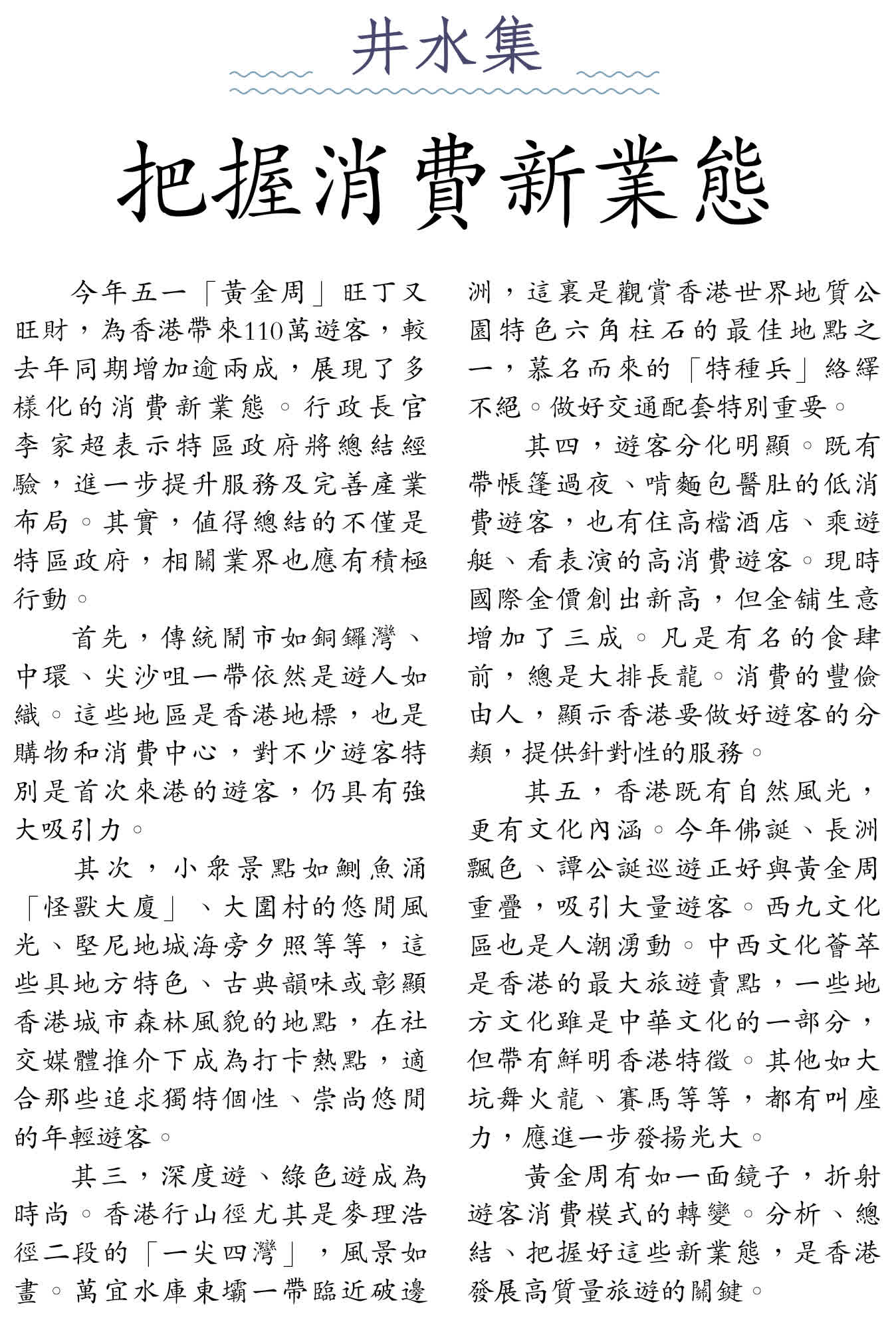 黃金周有如一面鏡子,折射遊客消費模式的轉變。分析、總結、把握好這些新業態,是香港發展高質量旅遊的關鍵。
