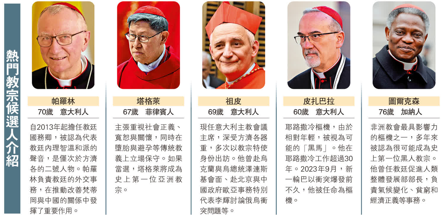 在133位樞機中,有108位是方濟各任命的,他們大多與方濟各的志向相同。也有專家表示,鑒於目前的國際形勢,教會或許更希望選出一位較為溫和、謹慎的教宗。