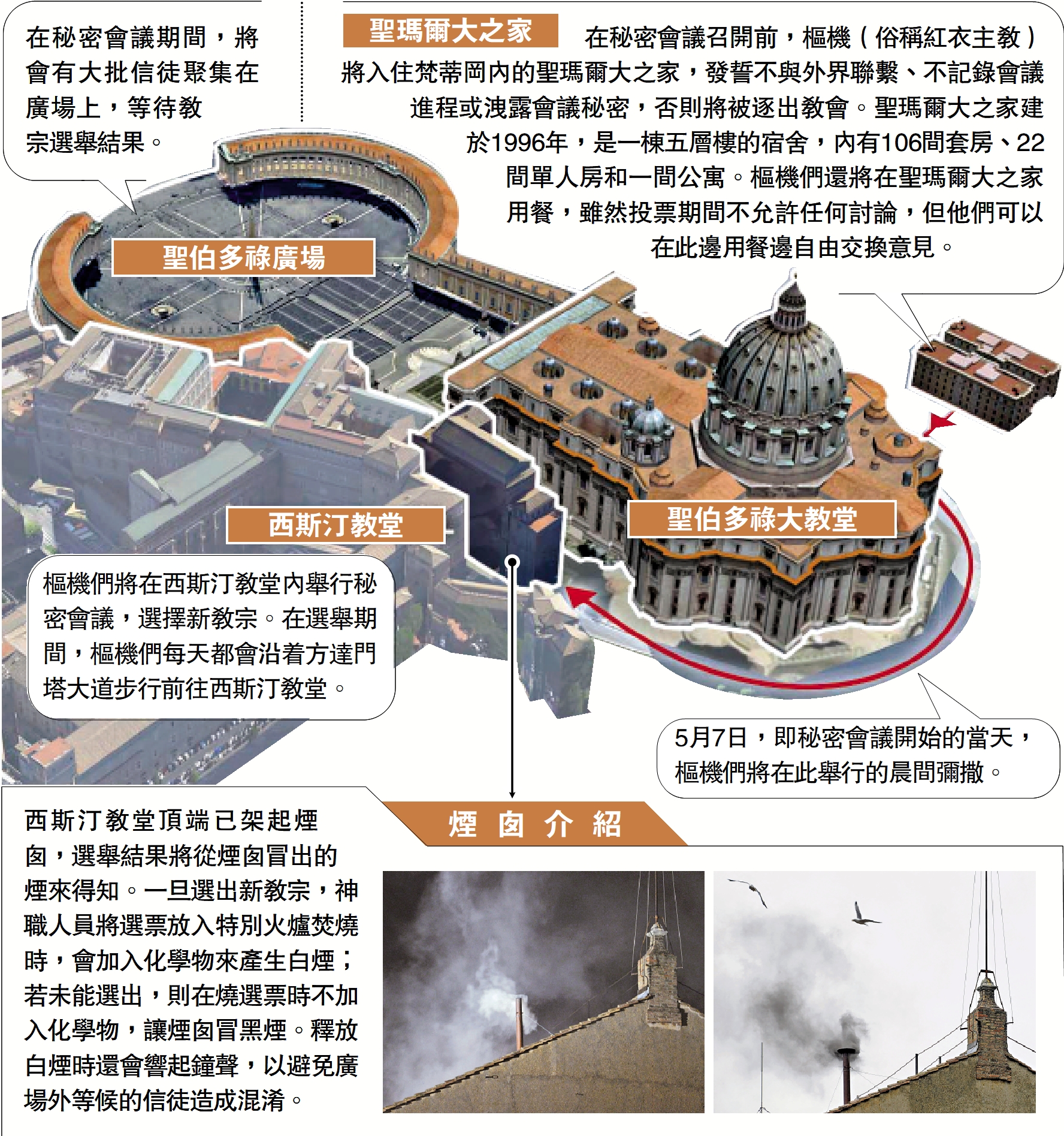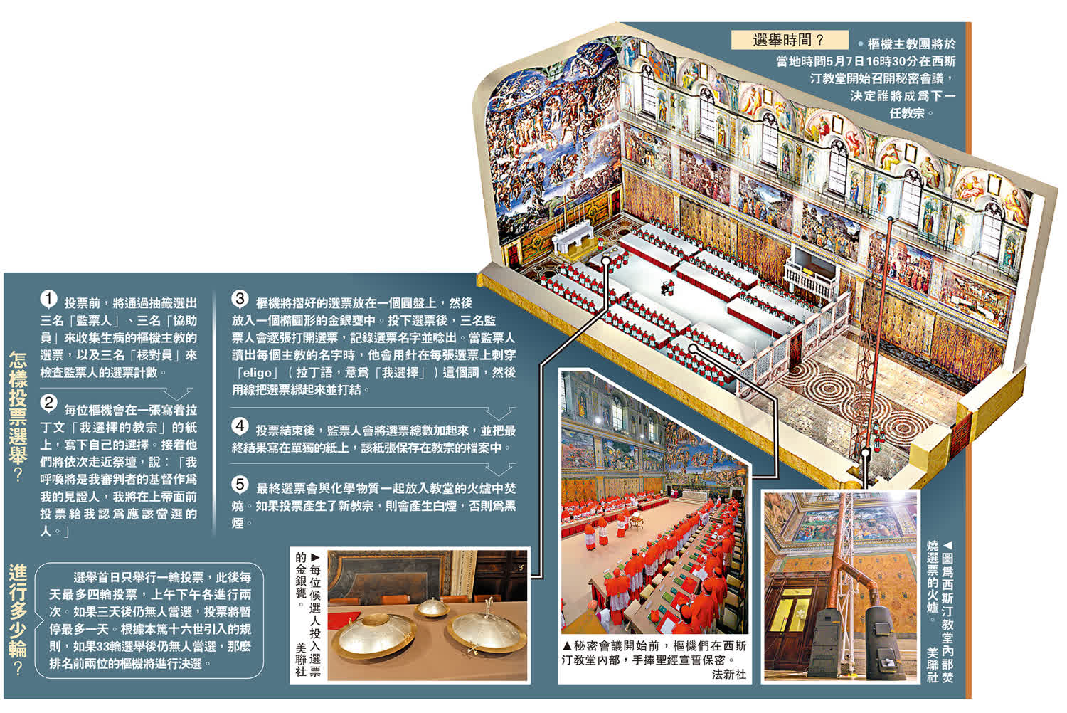 梵蒂岡發言人布魯尼(Matteo Bruni)6日介紹,5月7日上午,樞機團將為選舉教宗會議奉獻一台感恩祭(彌撒);同日下午4時30分(本港時間7日晚10時30分),樞機團將前往西斯汀教堂,閉門進行不記名投票,其間要切斷與外界的通訊,手機、報紙及信件一律沒收,晚上留在聖瑪爾大之家休息。