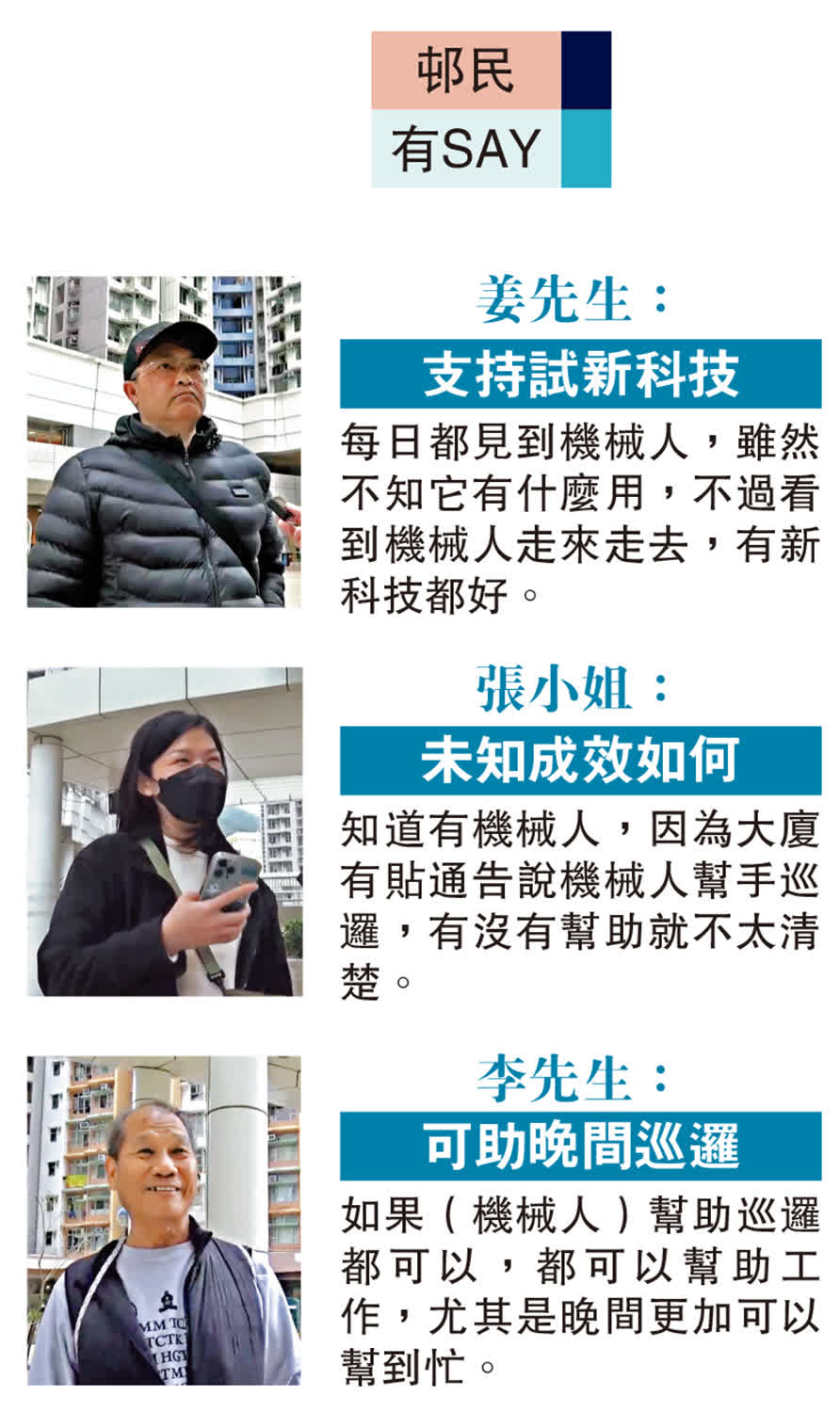 大公報記者日前走訪多個智慧屋邨管理試點,看到保安、清潔等的機械人在勤勞地工作,除了石排灣邨,在皇后山邨一樓平台,發現兩款外形迥異的機械人。其中一款白色機械人由三名身穿制服的工作人員操控,旁邊一人手持平板電腦,指揮機械人移動。當記者詢問是否已投入服務時,工作人員表示仍在測試階段。事實上,該邨內引入智能清潔及安防巡檢機器人,清潔機械人可全天候動態巡掃,提升環境維護效率;安防巡檢機械人具備即時監控與環境感知技術,強化安全防控能力。一名負責操作機械人的保安員向記者透露,每日都在電腦中設定好路線,現在仍屬試用中,早更及中更每段時間運作一次,每次半小時,沿途會拍攝影像,及後會傳輸去管理處,他笑說:「時代進步了,全部機械化。」