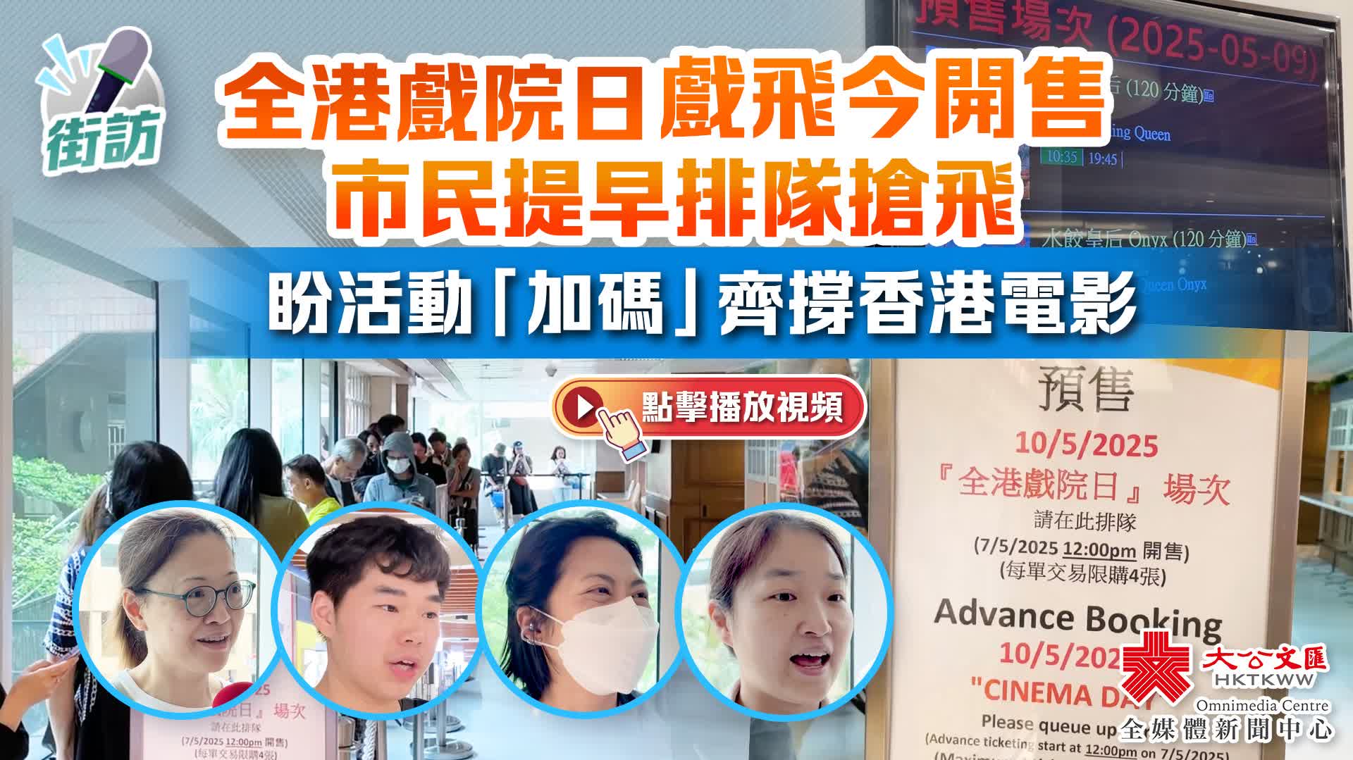 大公文匯全媒體報道,本港今年連續第三年舉行「全港戲院日」,5月10日當天,全港53間戲院的電影票劃一30港元。戲飛於今日(7日)中午12時開售,大公文匯全媒體記者於上午11時半來到沙田新城市廣場的電影院MCL MOVIE TOWN,已看到等待搶飛的長龍,不少市民選擇買足4張戲飛,一家大細齊撐香港電影。