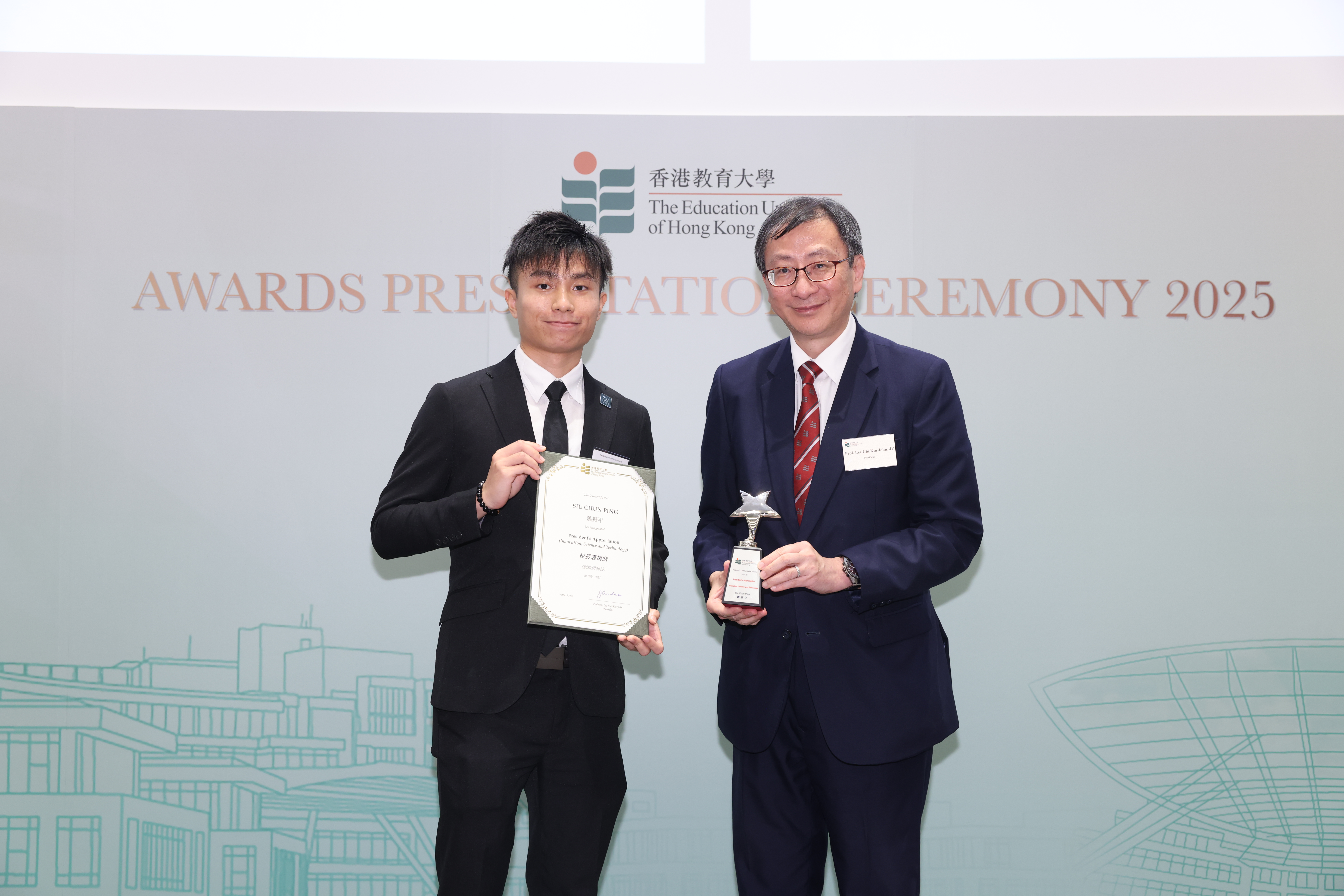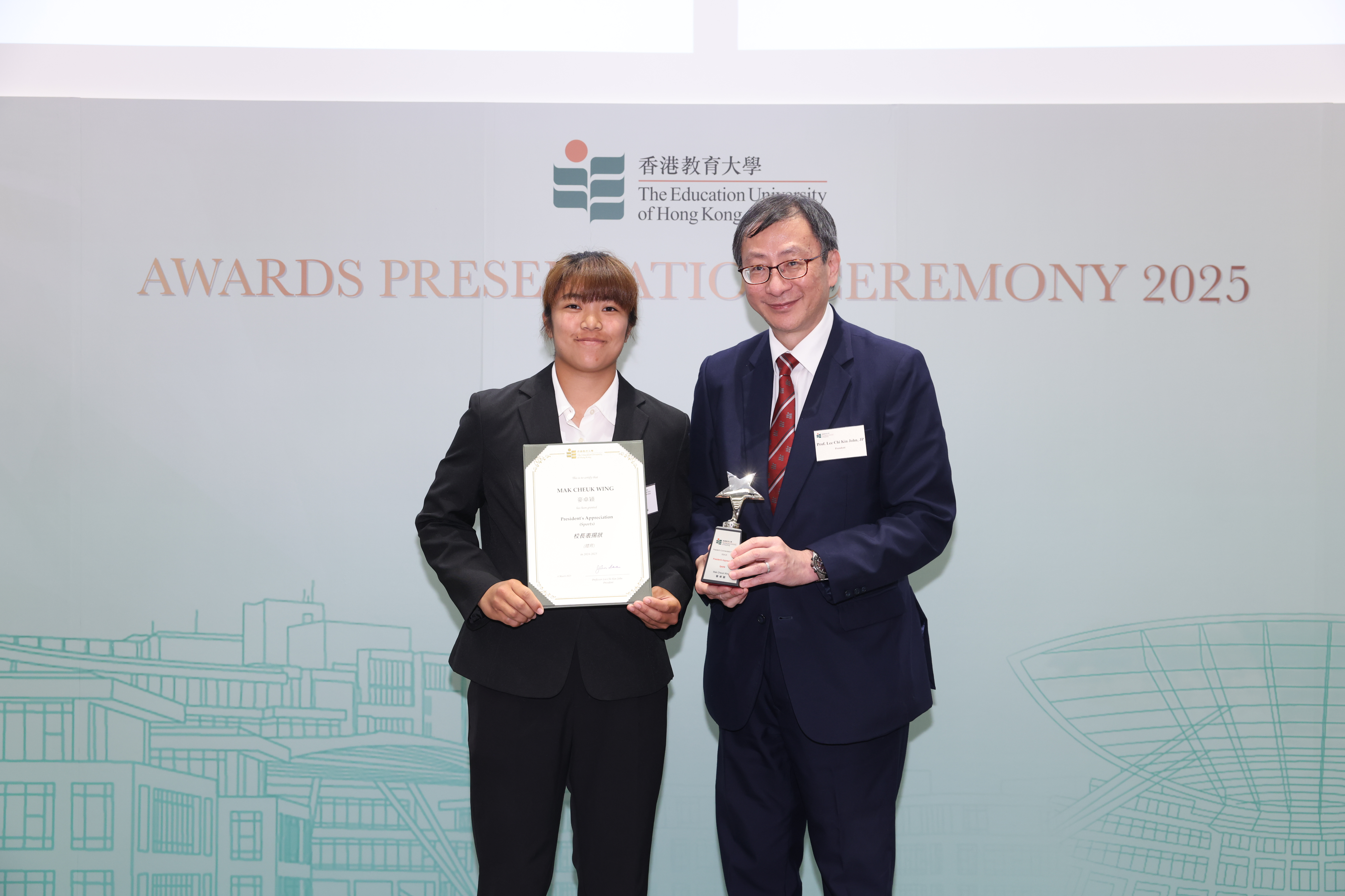 典禮上,教大首先頒發了2024/25年度「校長嘉許計劃」獎項,七名獲獎學生當中有三人榮獲「校長嘉許狀」,一位是獲得社會服務獎的教育碩士課程一年級學生郭汝鏗,他一直致力於推行社區特殊教育需要的融合運動教育,幫助有特殊需要的兒童融入主流社會。第二位是獲運動獎的中文研究文學碩士(語文教育)課程一年級學生張凱元,她不僅在各類柔道比賽中屢獲殊榮,更積極參與校內外的運動推廣活動。第三位也獲運動獎的是哲學博士課程一年級學生曾熙,她熱衷臥推運動,不斷突破自我。而「校長表揚狀」則頒授給了四位學生,即獲創新與科技獎的中學教育榮譽學士-資訊及通訊科技課程四年級學生蕭振平,和另三位均獲體育獎的運動科學及教練榮譽理學士課程二年級學生黃瀚霆、體育教育榮譽學士課程二年級學生麥卓穎,以及體育教育榮譽學士課程一年級學生何卓橋。