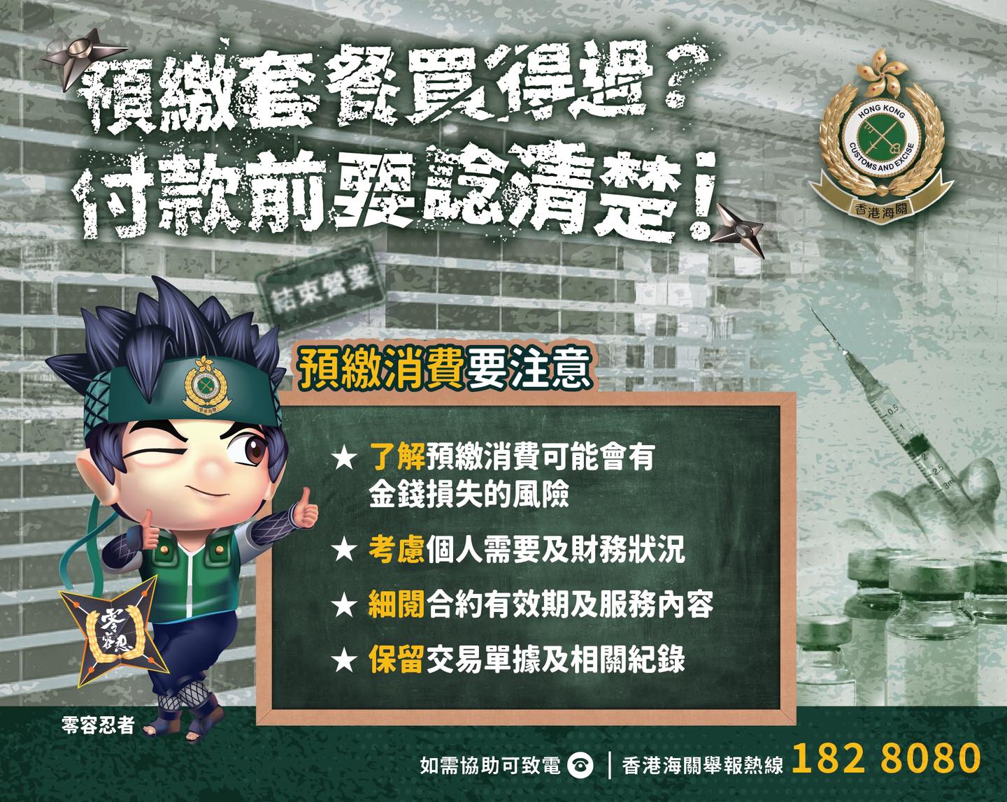 海關提醒消費者,於購買服務時亦應光顧信譽良好的商戶,在作出預繳式消費決定前要謹慎考慮。於購買服務後,應保留交易單據及合約等文件,若日後需作出申訴,可作為基本資料。